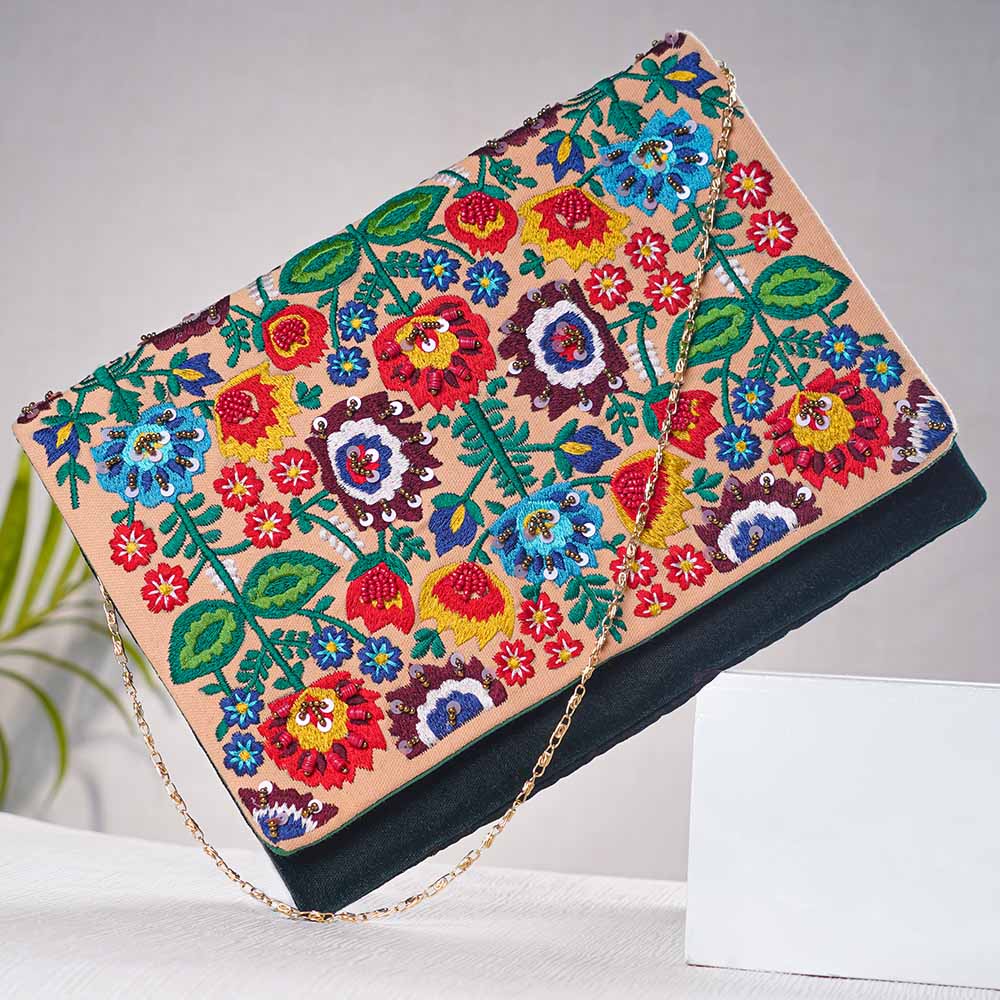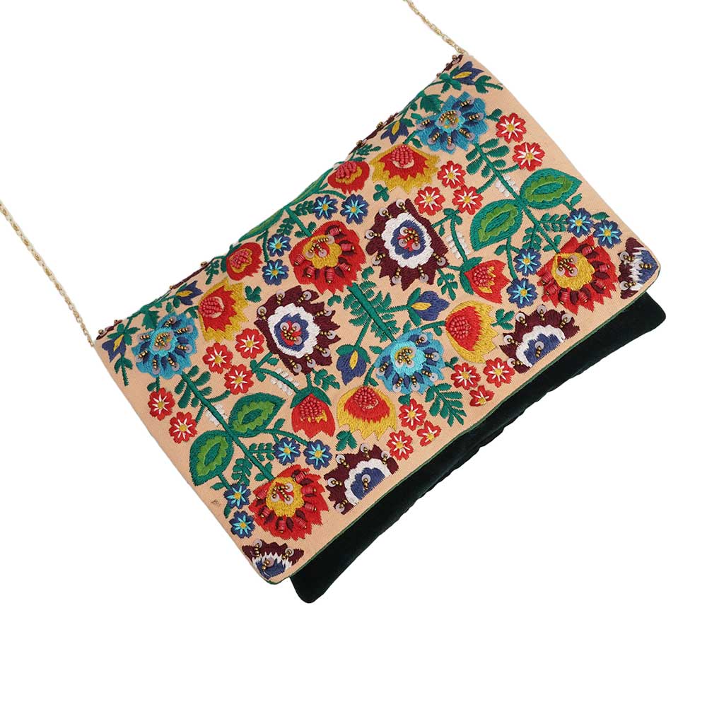 Introducing our beautiful small sling bag for women, handcrafted by skilled craftsmen with the finest quality cotton and adorned with exquisite beads. This stunning bag features intricate blue and red flower engravings on a light pink base, creating a striking contrast that is sure to turn heads. Perfect for use as an office bag, a bag for going out or traveling, this versatile sling bag is sure to become your go-to accessory. The convenient sling design allows you to wear it comfortably across your body, leaving your hands free for other tasks. Not only is this bag a stylish addition to any outfit, it also makes a thoughtful gift for your family, friends, or relatives. Show them how much you care with a gift that is both beautiful and practical. So if you're looking for bags for women that are both functional and fashionable, look no further than our stunning handcrafted sling bag.