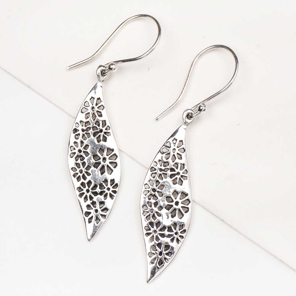 Floral Filigree 92.5 Sterling silver earrings in long oval drop earrings is the ideal choice of girls and women of all age and groups. It has many flowers engraved in long oval shape earrings and matches any traditional as well s western attire. Easy and comfortable to wear all day long.