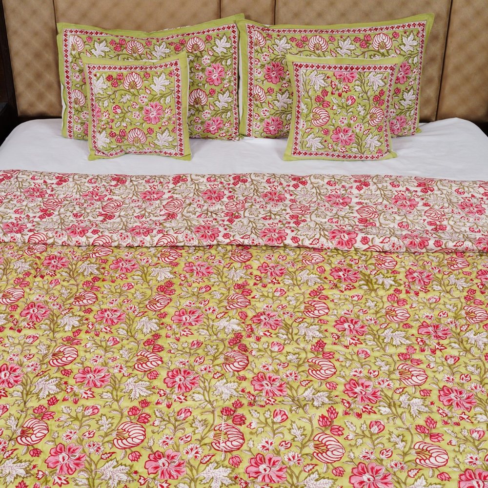 This green and pink Malmal (Voile) quilt is a celebration of delicate craftsmanship and traditional Indian block printing. Featuring blooming floral motifs on a refreshing green base, it combines elegance with cozy comfort. Expertly handmade and quality-checked by Indianshelf, this quilt adds artisanal charm to your bedroom décor.