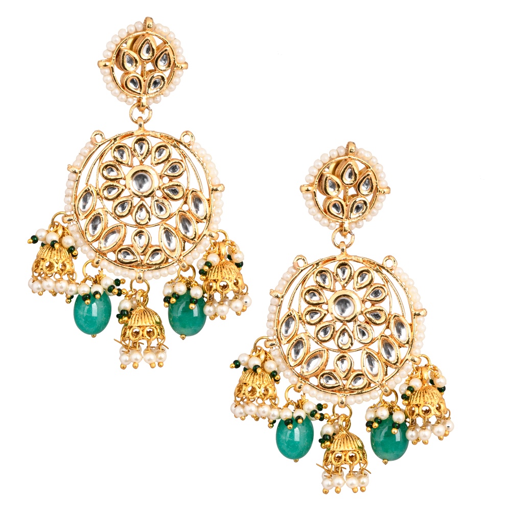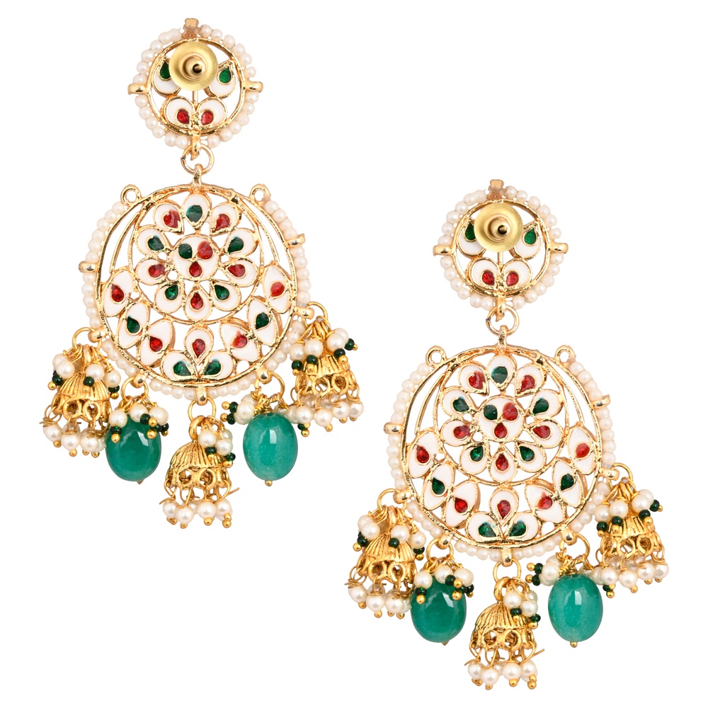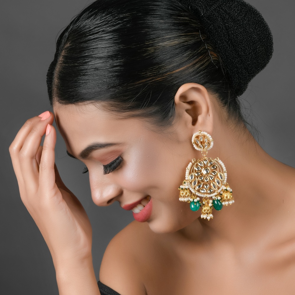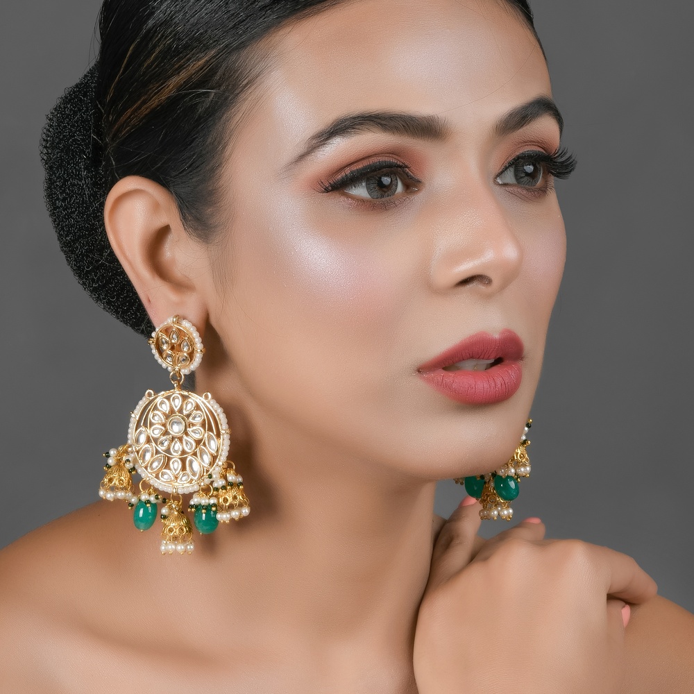 - Smaller mandala stud at the top and ornate jhumka drops with pearls and green beads