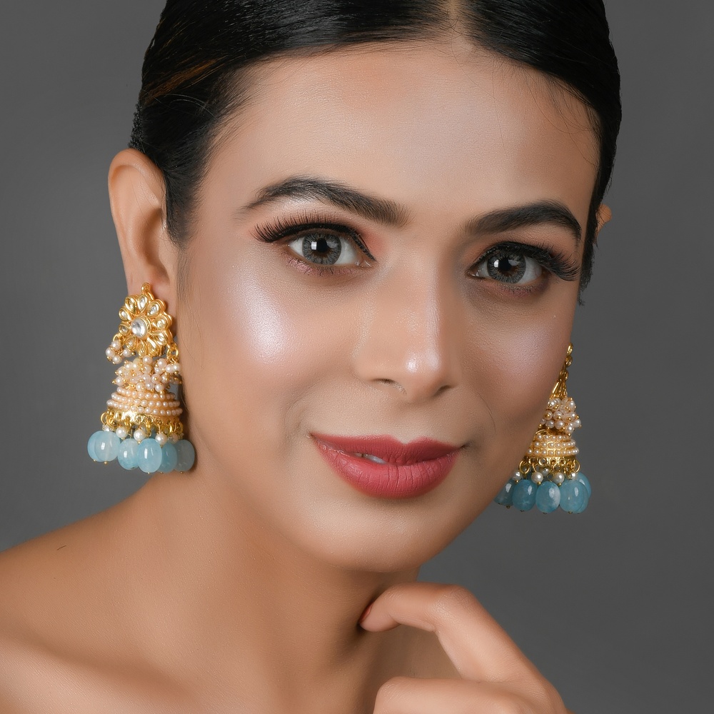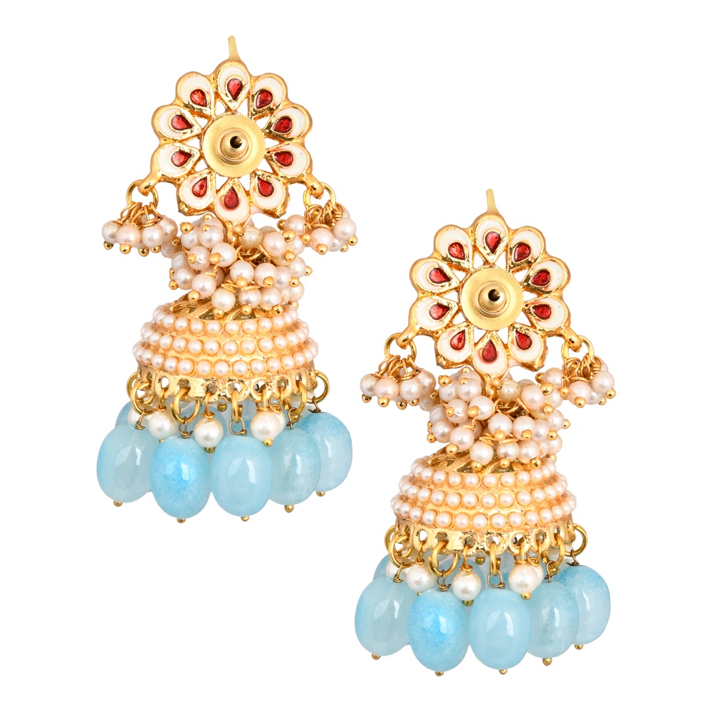 These earrings unite mirror-petal flower motifs, pearls, and aquamarine-colored bead drops, creating a captivating statement piece that appeals to modern and traditional jewellery lovers.