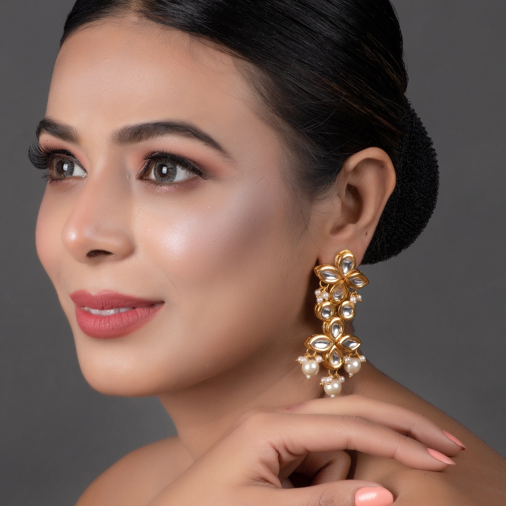 These statement earrings showcase mirror-petal clusters and pearly jhumkas, creating a sophisticated look that appeals to gifters, collectors, and style enthusiasts.