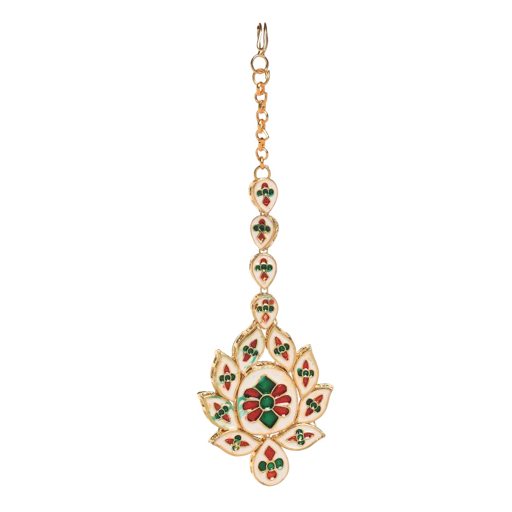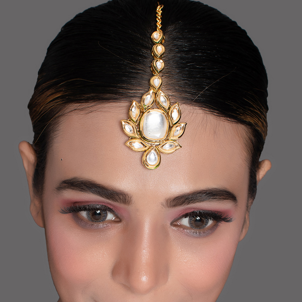 Elegant and well-balanced, this floral mirror stone maang tikka is designed to accentuate the centre parting with refined traditional charm. The piece features a layered petal-inspired arrangement of mirror-style stones, highlighted by a prominent central accent that draws focus gracefully to the forehead. Maang Tikka Highlights Handcrafted with precision, this maang tikka blends heritage stone artistry with a clean floral silhouette. Floral design with layered mirror-style stone placement Central statement stone framed by petal-shaped accents Lightweight construction for comfortable, all-day wear Secure chain with hook for stable placement Crafted by skilled artisans using traditional jewellery techniques Specs & Materials Material: Metal alloy with mirror-style stones Colour: Warm gold tone with reflective clear stones Design: Floral maang tikka with elongated drop silhouette Origin: Handmade in India and individually quality-checked Each piece may vary slightly due to handcrafted workmanship Ideal for bridal and festive styling Styling & Gift Inspiration Perfect for weddings, receptions, and traditional ceremonies Complements floral earrings, chokers, and statement necklaces A graceful gift for brides and festive occasions Adds symmetry and elegance without overpowering the look Care Guide Store the maang tikka in a dry pouch and avoid contact with water, perfume, or harsh chemicals. Gently wipe with a soft cloth after use to maintain shine and stone clarity. Artisan Craftsmanship This piece is entirely handmade using time-honoured techniques. All jewellery is handcrafted never machine-made ensuring individuality and refined artisanal character.