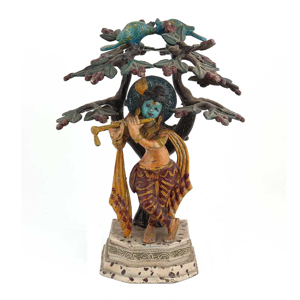 Perfect for your holy puja room or as a decor piece in the living room, this Brass statue of Lord Krishna playing his flute standing under an brass tree is heavenly and awe-inspiring. Handmade in the antique style, the beauty of the artistry work is exemplified in the union of various materials to highlight the different aspects of the item. It is equally deserving as a gifting item.