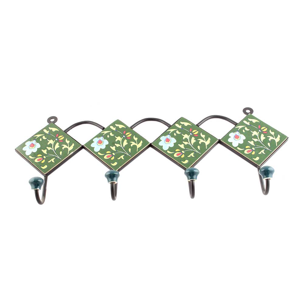 Forest Green And White Tiny Flower Ceramic Tiles Hooks. When Put on Wall or Cabinet It is An Art in Itself. The Metal Part of this Hook is Black Powder Coated.