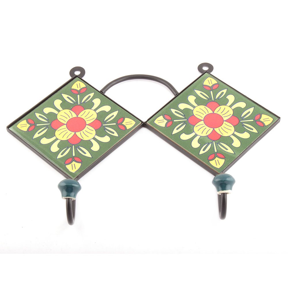 Forest Green And Yellow Ceramic Floral Tiles Hooks. When Put on Wall or Cabinet it is an Art in itself. The Metal Part of this Hook is Black Powder Coated.