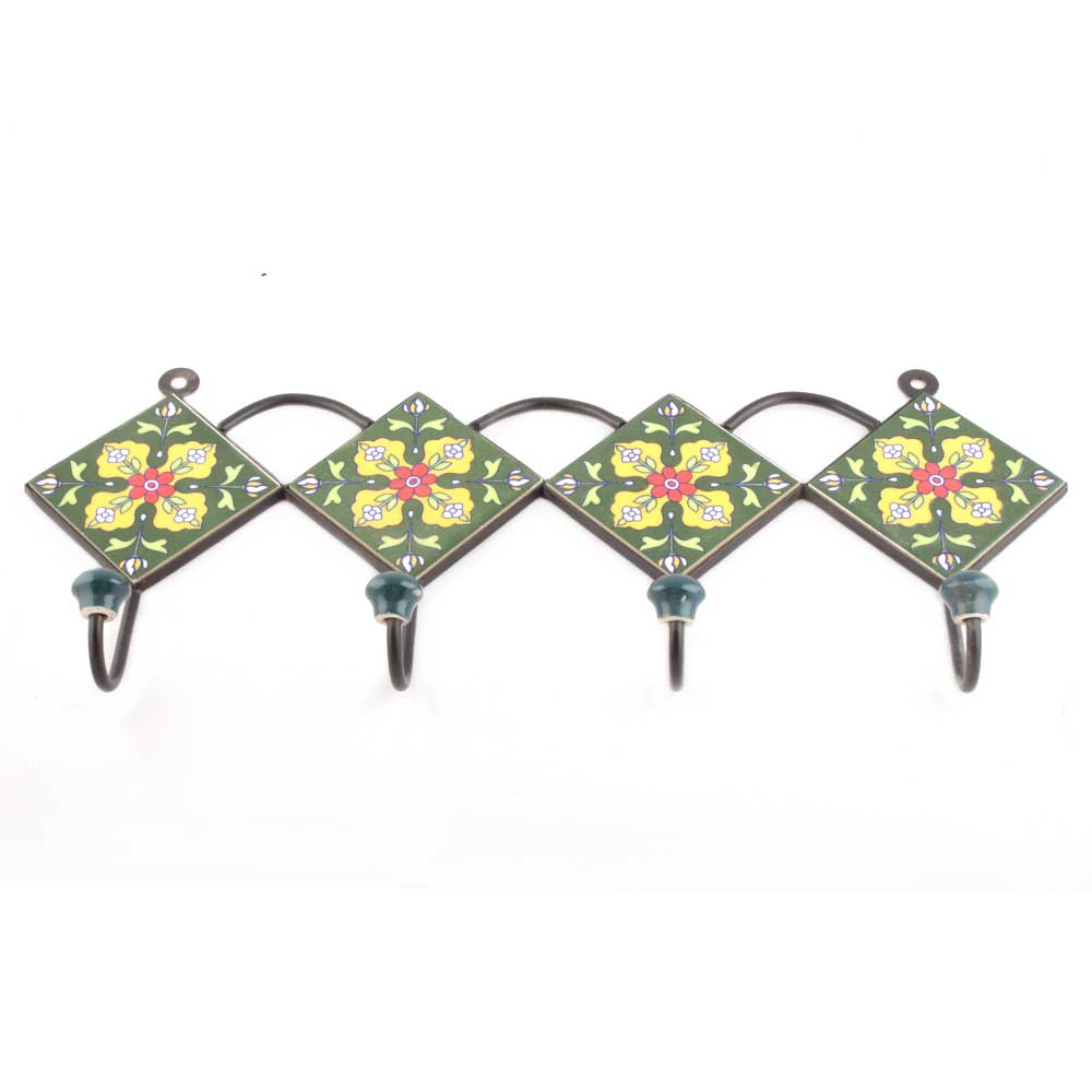 Forest Green And Yellow Ceramic Flower Tiles Hook. When Put on Wall or Cabinet It is An Art in Itself. The Metal Part of this Hook is Black Powder Coated.