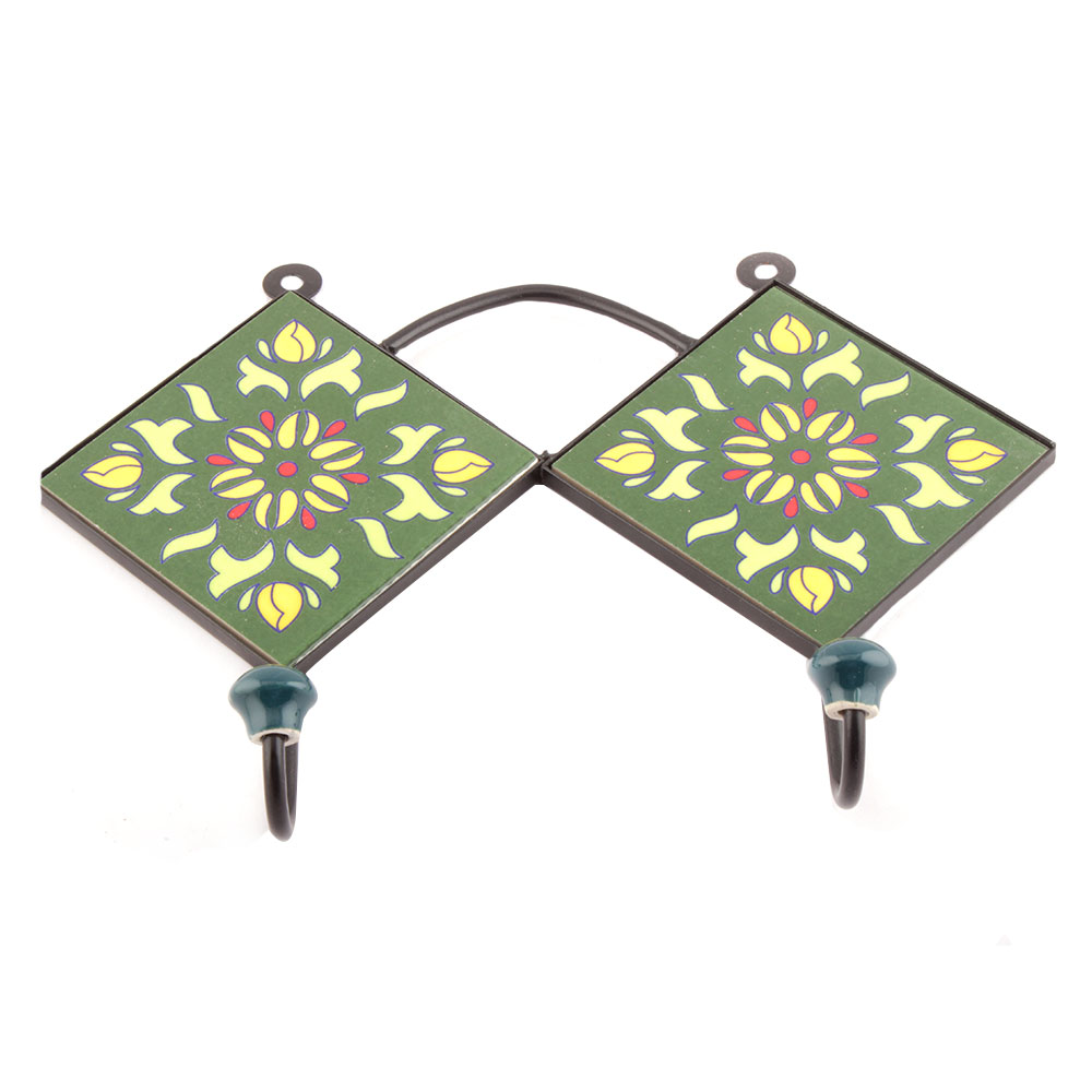 Forest Green And Yellow Ceramic Flower Tiles Hooks. When Put on Wall or Cabinet it is an Art in itself. The Metal Part of this Hook is Black Powder Coated.