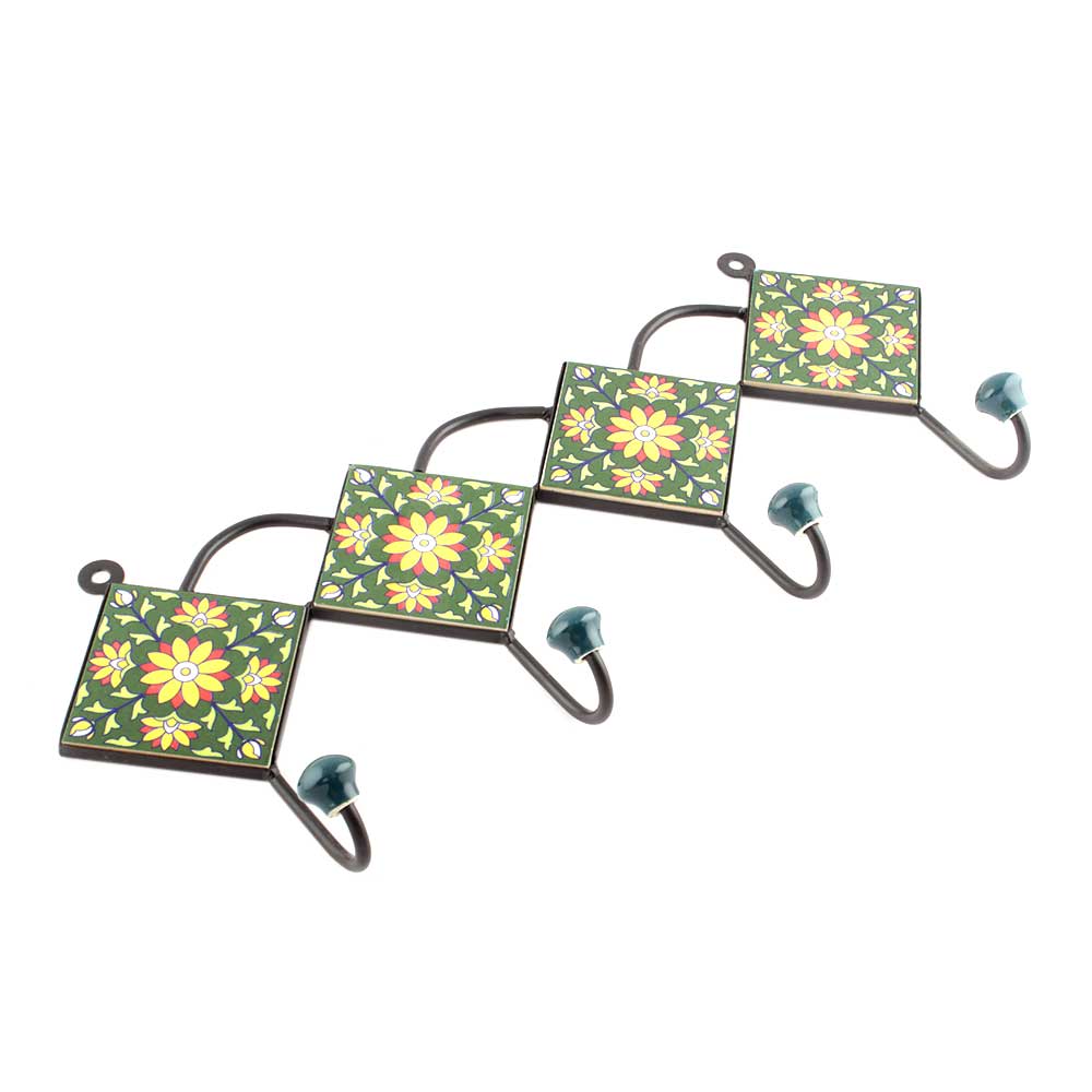 Forest Green And Yellow Sunflower Ceramic Tiles Hooks Online. When Put on Wall or Cabinet It is An Art in Itself. The Metal Part of this Hook is Black Powder Coated.