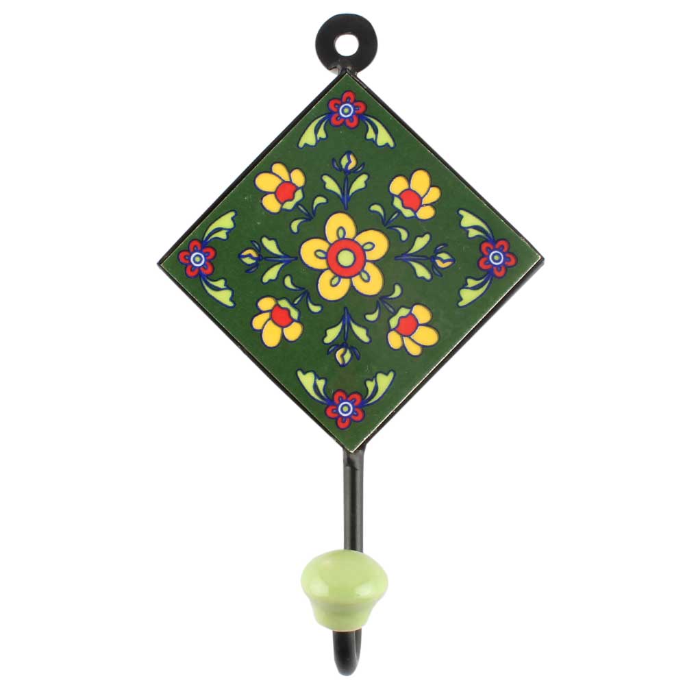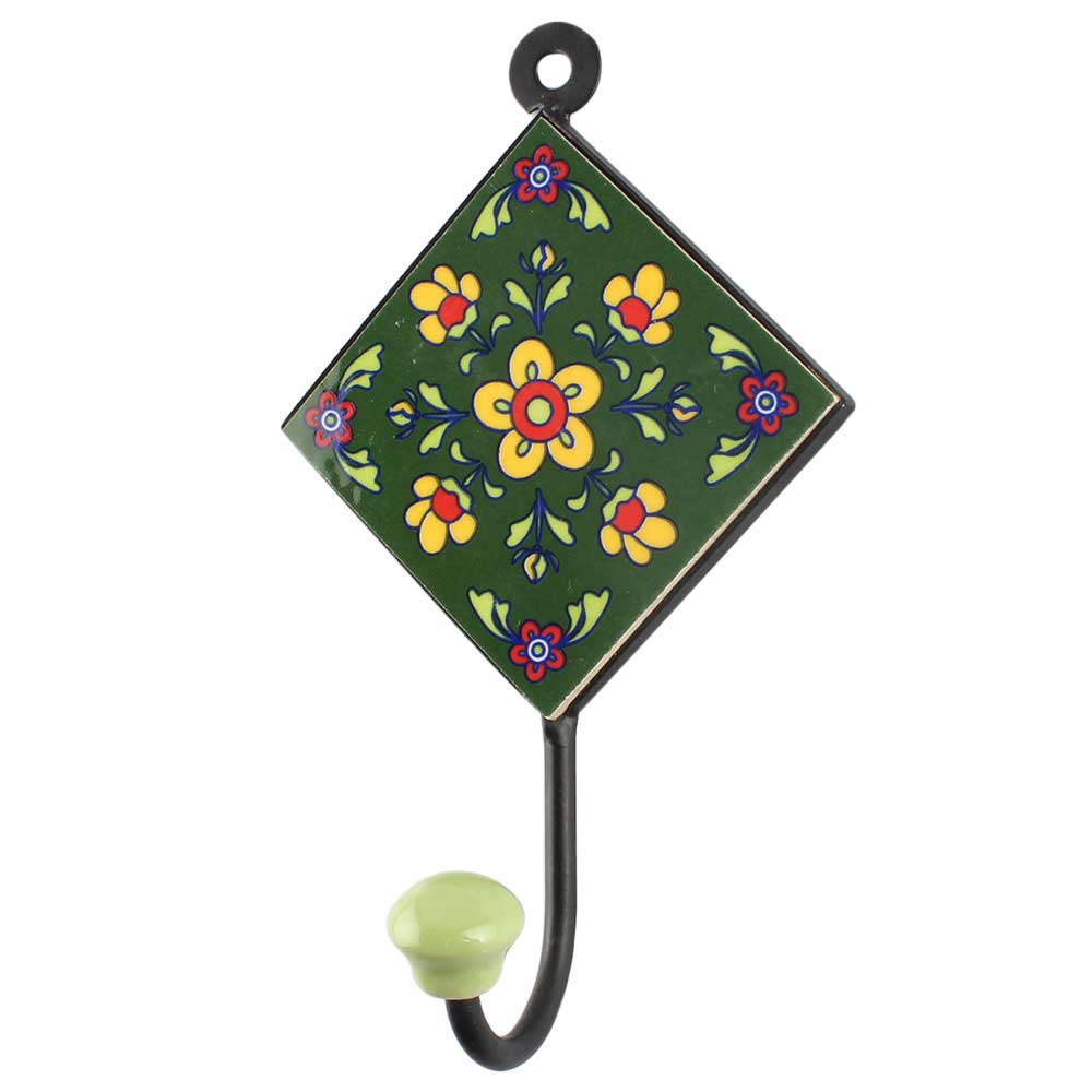 Forest Green Ceramic Floral Tile Hook. When Put on Wall or Cabinet It is An Art in Itself. The Metal Part of this Hook is Black Powder Coated.
