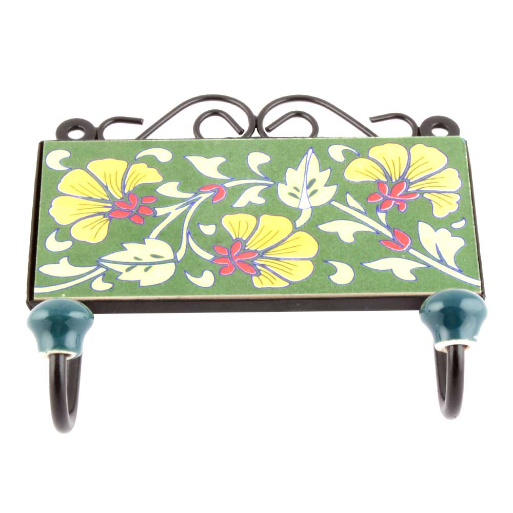 Forest Green Ceramic Flower Tiles Hooks. When Put on Wall or Cabinet it is an Art in itself. The Metal Part of this Hook is Black Powder Coated.