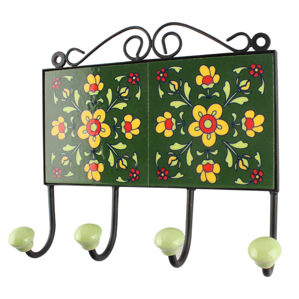 Forest Green Ceramic Tile Hook. When Put on Wall or Cabinet It is An Art in Itself. The Metal Part of this Hook is Black Powder Coated.