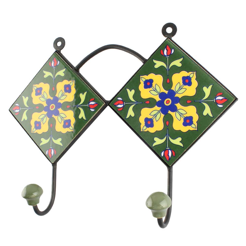 Forest Green Floral Ceramic Tile Hook. When Put on Wall or Cabinet It is An Art in Itself. The Metal Part of this Hook is Black Powder Coated.