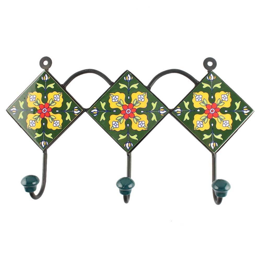 Forest Green Floral Ceramic Tile Hook. When Put on Wall or Cabinet It is An Art in Itself. The Metal Part of this Hook is Black Powder Coated.
