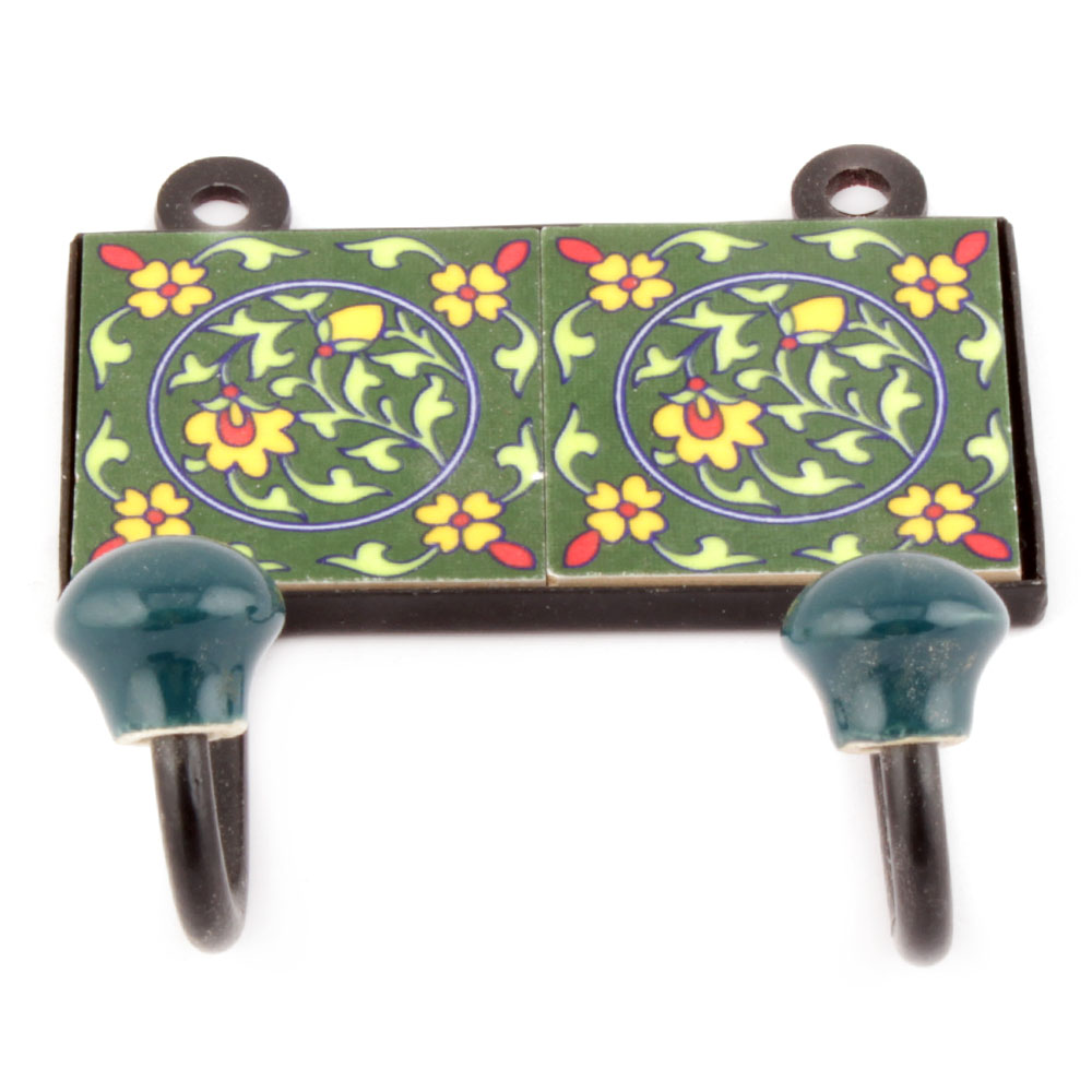 Forest Green Ceramic Floral Tiles Hooks. When Put on Wall or Cabinet it is an Art in itself. The Metal Part of this Hook is Black Powder Coated.