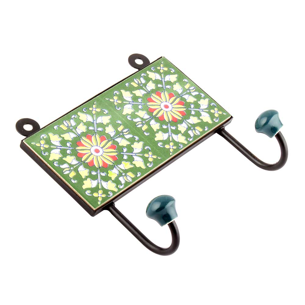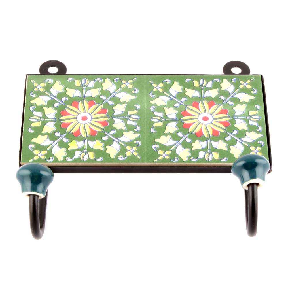 Forest Green Flower Ceramic Tiles Hooks Online. When Put on Wall or Cabinet it is an Art in itself. The Metal Part of this Hook is Black Powder Coated.