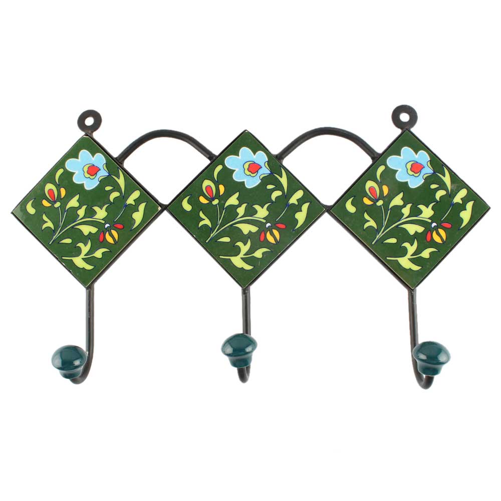 Forest Green Leaf Ceramic Floral Tile Wall Hook. When Put on Wall or Cabinet It is An Art in Itself. The Metal Part of this Hook is Black Powder Coated.