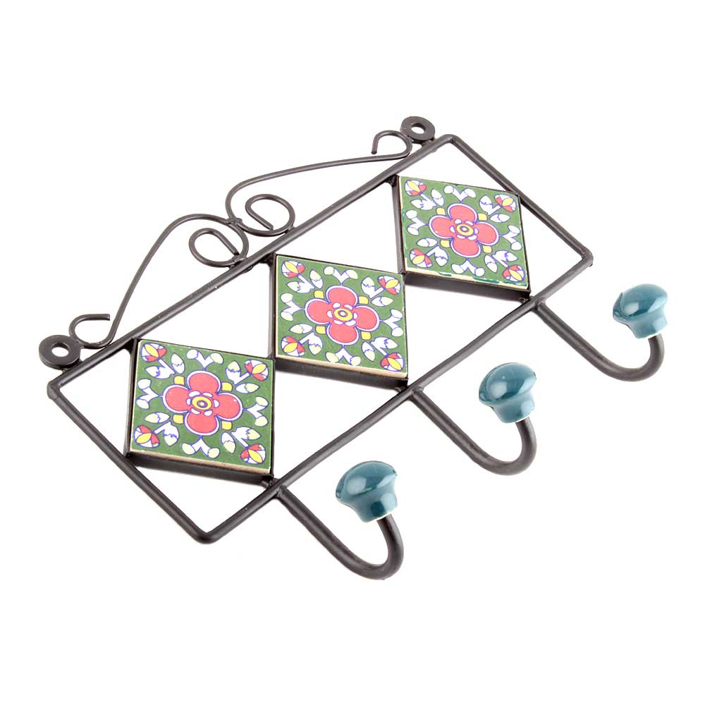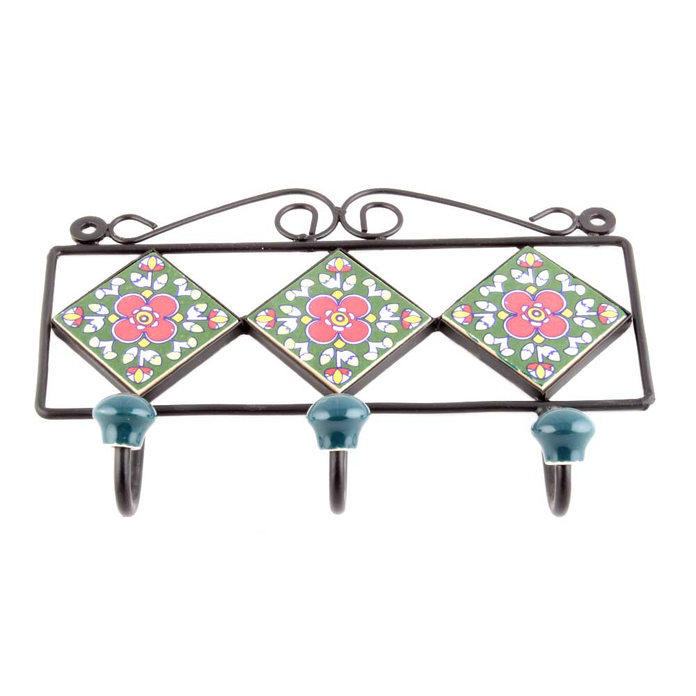 Forest Green Red Floral Tiles Hooks. When Put on Wall or Cabinet it is an Art in itself. The Metal Part of this Hook is Black Powder Coated.