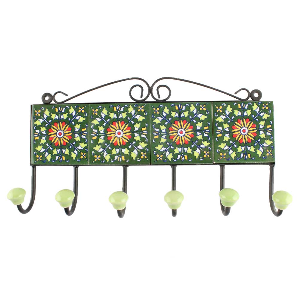 Forest Green Wheel Flower Ceramic Tile Hook. When Put on Wall or Cabinet It is An Art in Itself. The Metal Part of this Hook is Black Powder Coated.