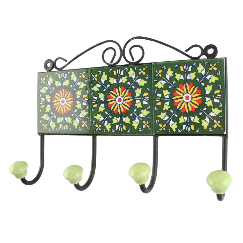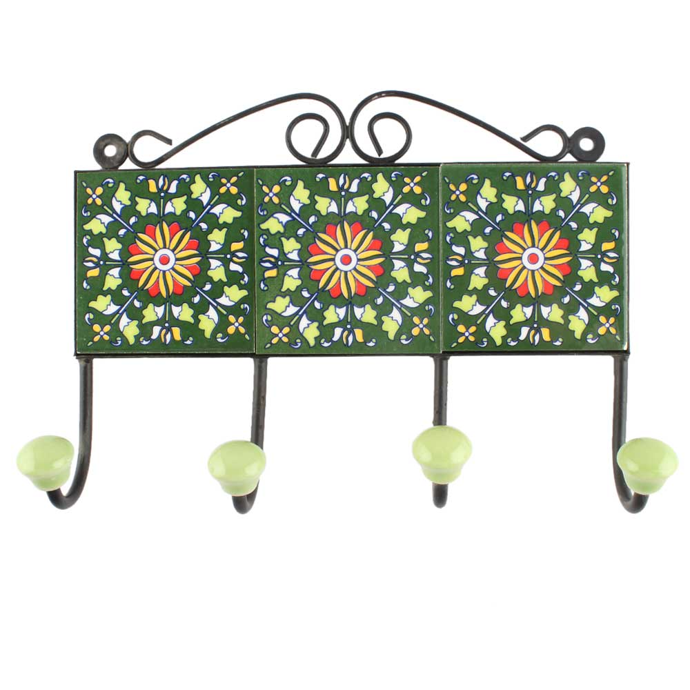 Forest Green Wheel Flower Ceramic Tile Hook. When Put on Wall or Cabinet It is An Art in Itself. The Metal Part of this Hook is Black Powder Coated.