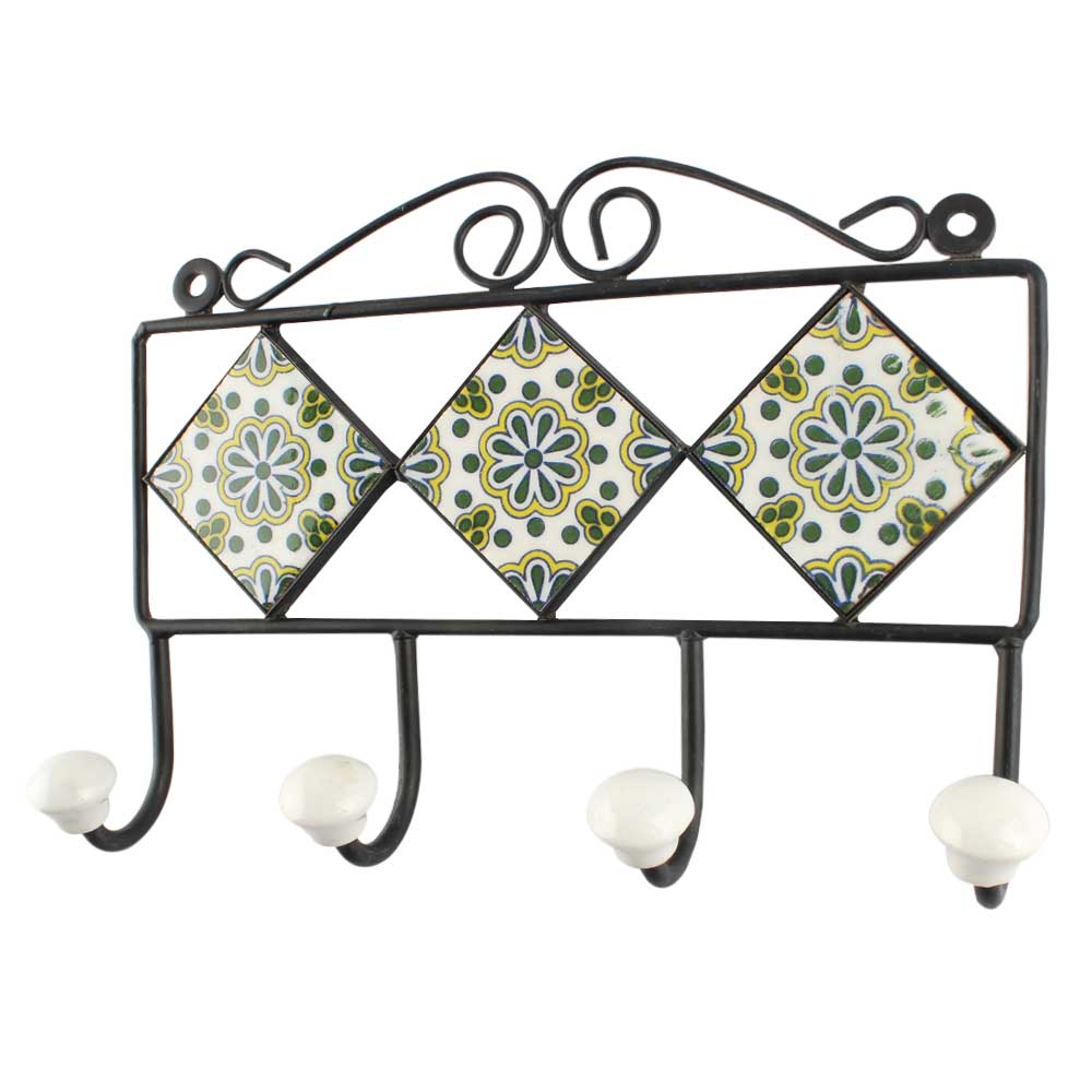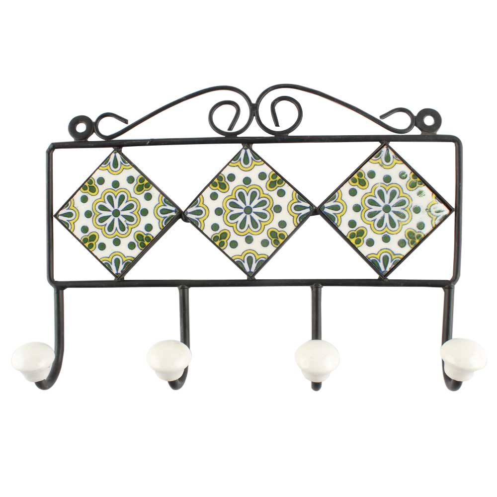 Forest Green Wheel Flower Ceramic Tile Wall Hook. When Put on Wall or Cabinet It is An Art in Itself. The Metal Part of this Hook is Black Powder Coated.