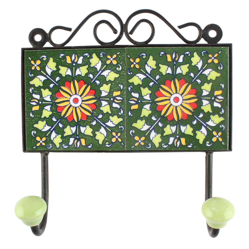 Forest Green wheel flower Ceramic Tile wall Hook. When Put on Wall or Cabinet It is An Art in Itself. The Metal Part of this Hook is Black Powder Coated.