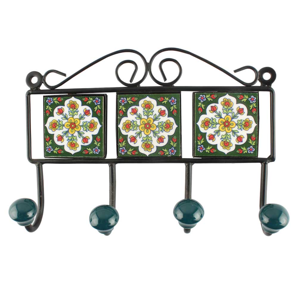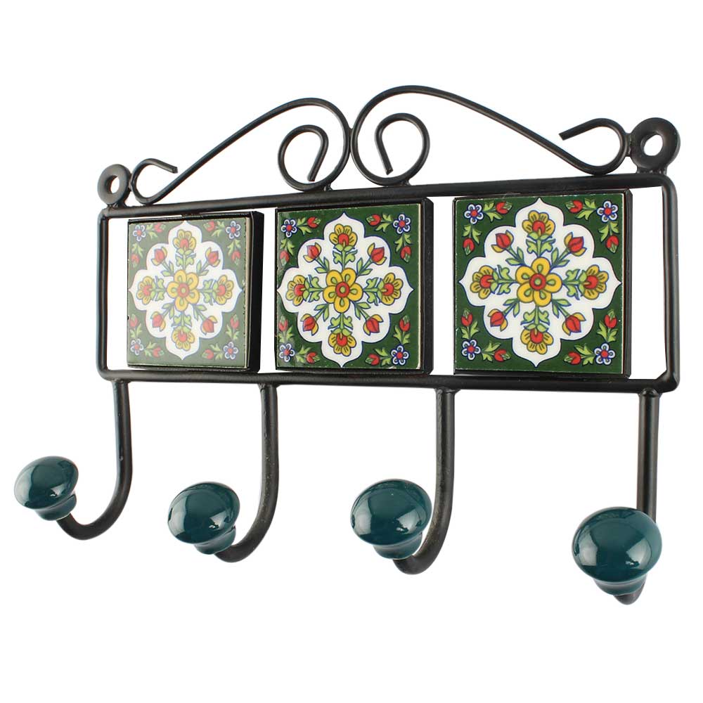 Forest Green with white Ceramic Floral Tile Hook. When Put on Wall or Cabinet It is An Art in Itself. The Metal Part of this Hook is Black Powder Coated.