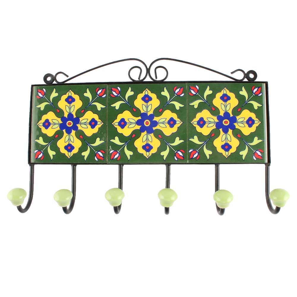 Forest Green With Yellow Flower Ceramic Tile Hook Online. When Put on Wall or Cabinet It is An Art in Itself. The Metal Part of this Hook is Black Powder Coated.