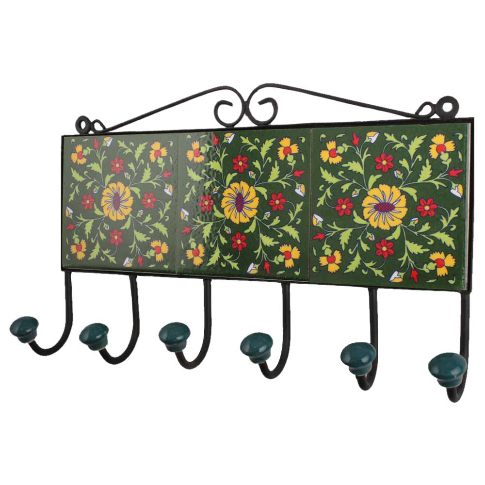 forest Green Yellow Floral Tiles Hook. When Put on Wall or Cabinet It is An Art in Itself. the Metal Part of This Hook is Black Powder Coated.