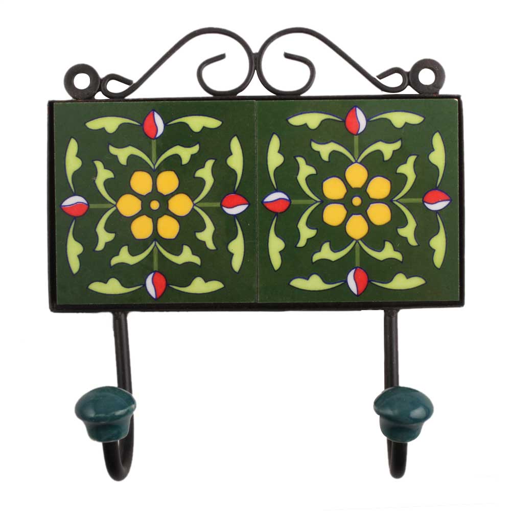 forest Green Yellow Floral Tiles Hook. When Put on Wall or Cabinet It is An Art in Itself. the Metal Part of This Hook is Black Powder Coated.