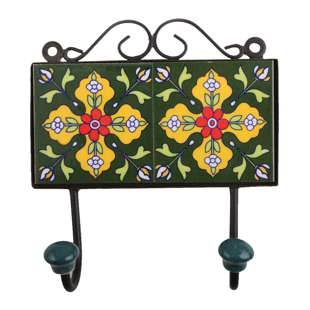 forest Green Yellow Floral Tiles Hook. When Put on Wall or Cabinet It is An Art in Itself. the Metal Part of This Hook is Black Powder Coated.