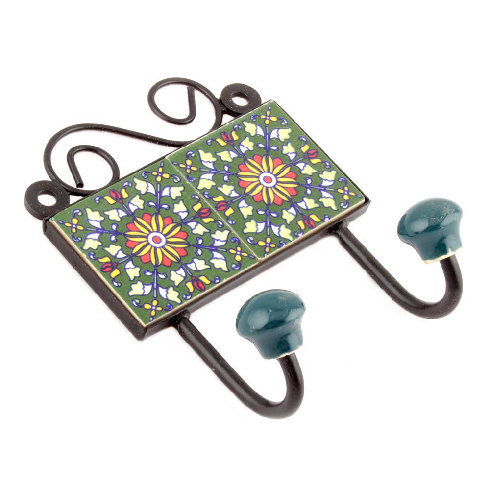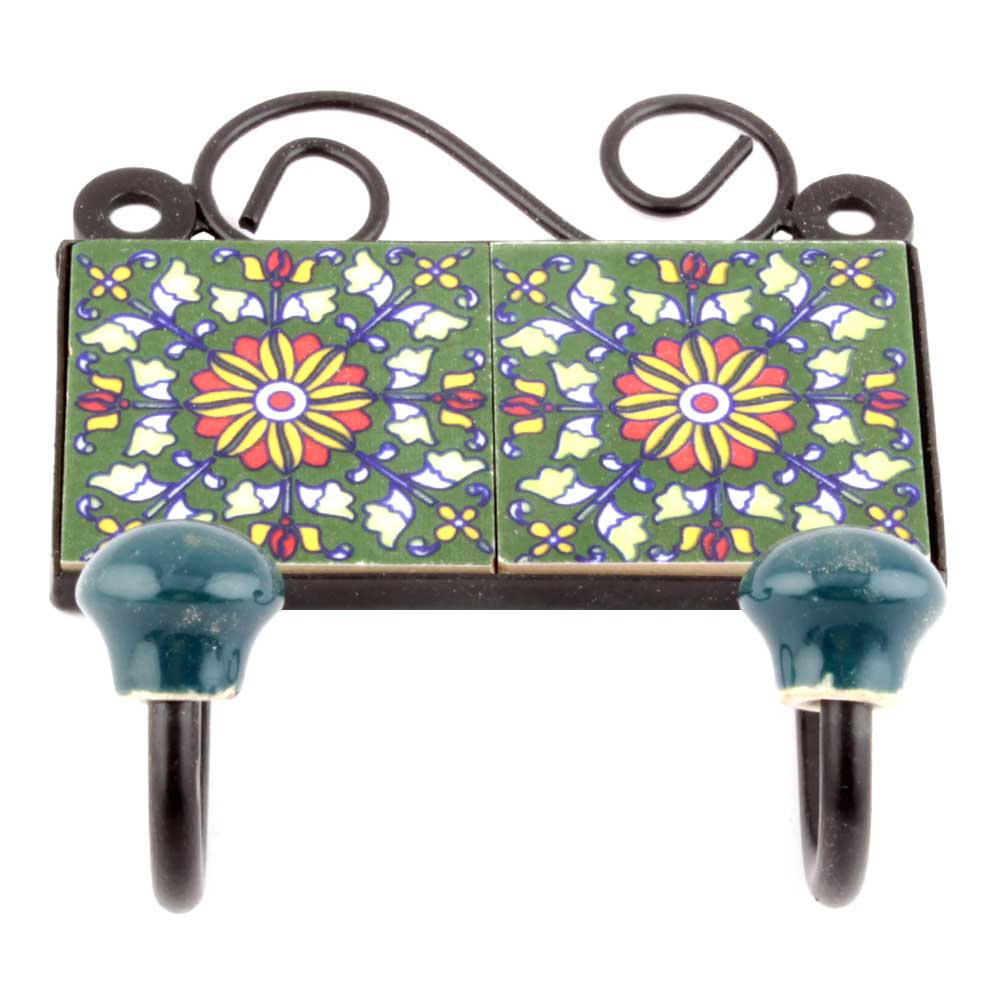 Forest Green Yellow Flower Tiles Hooks. When Put on Wall or Cabinet it is an Art in itself. The Metal Part of this Hook is Black Powder Coated.
