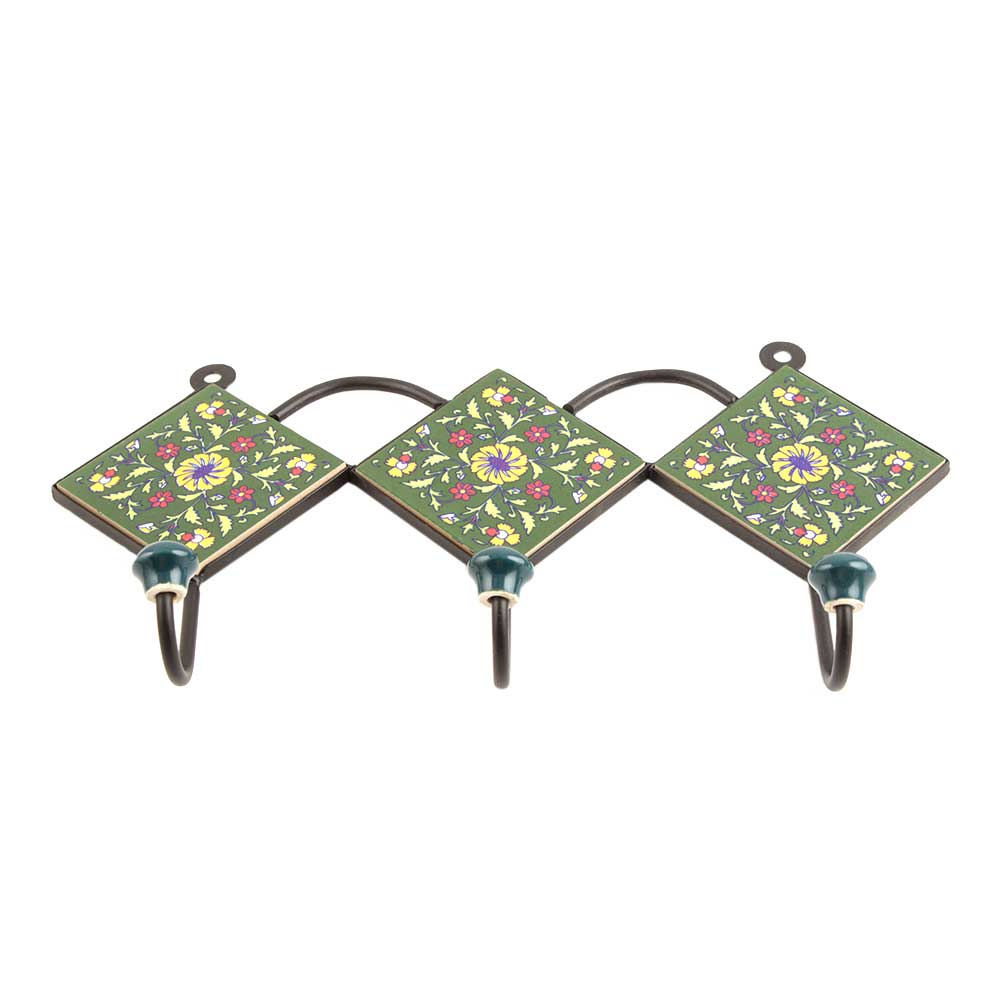 Forest Green Yellow Flower Tiles Hook. When Put on Wall or Cabinet It is An Art in Itself. the Metal Part of This Hook is Black Powder Coated.
