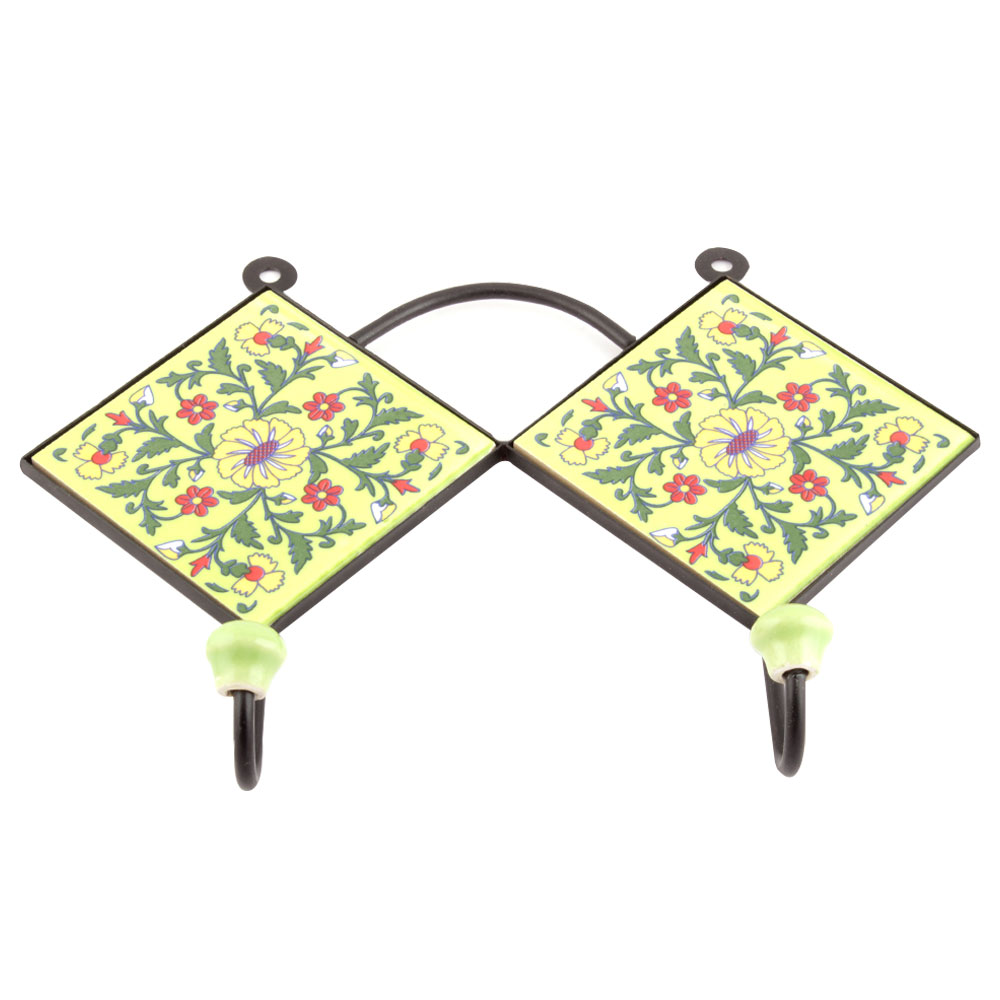 Forest Green And Yellow Wheel Flower Tiles Hooks. When Put on Wall or Cabinet it is an Art in itself. The Metal Part of this Hook is Black Powder Coated.