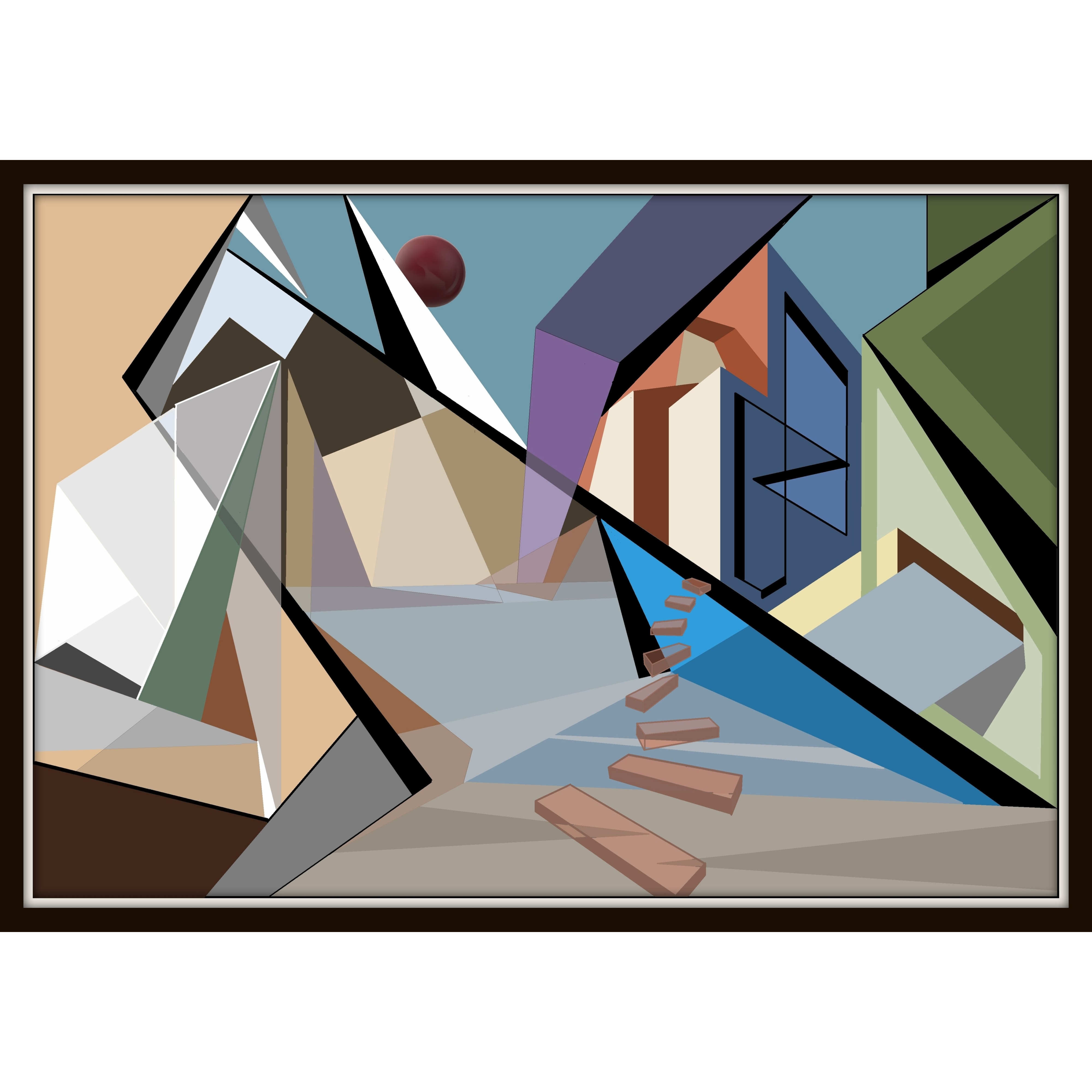 Fragments of Perspective is a striking digital artwork printed on canvas paper, exploring the interplay of form, depth, and abstraction. Composed of sharp angles, geometric fragments, and intersecting planes, the piece challenges the viewer's perception of space and structure. Muted tones of beige, green, and slate blue contrast with bold blacks and unexpected bursts of color, guiding the eye through a maze of layered perspectives. The scattered bricks and architectural forms hint at both construction and deconstruction—an unfolding narrative of transformation. This artwork evokes a sense of dynamic tension, capturing the fractured beauty found in shifting viewpoints and evolving realities.