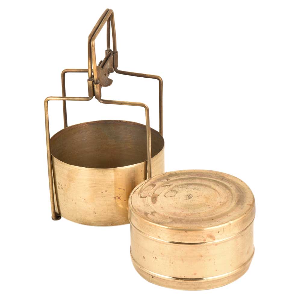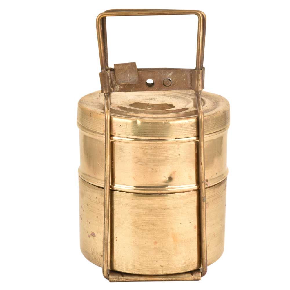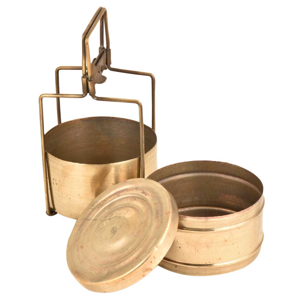 This is an old brass lunch box with two containers. The brass lunch boxes were very popular in those days and people used to coat with other layer of metal also known as KALI .The boxes were are engraved wit the names of the owner so that it could not be misplaced.