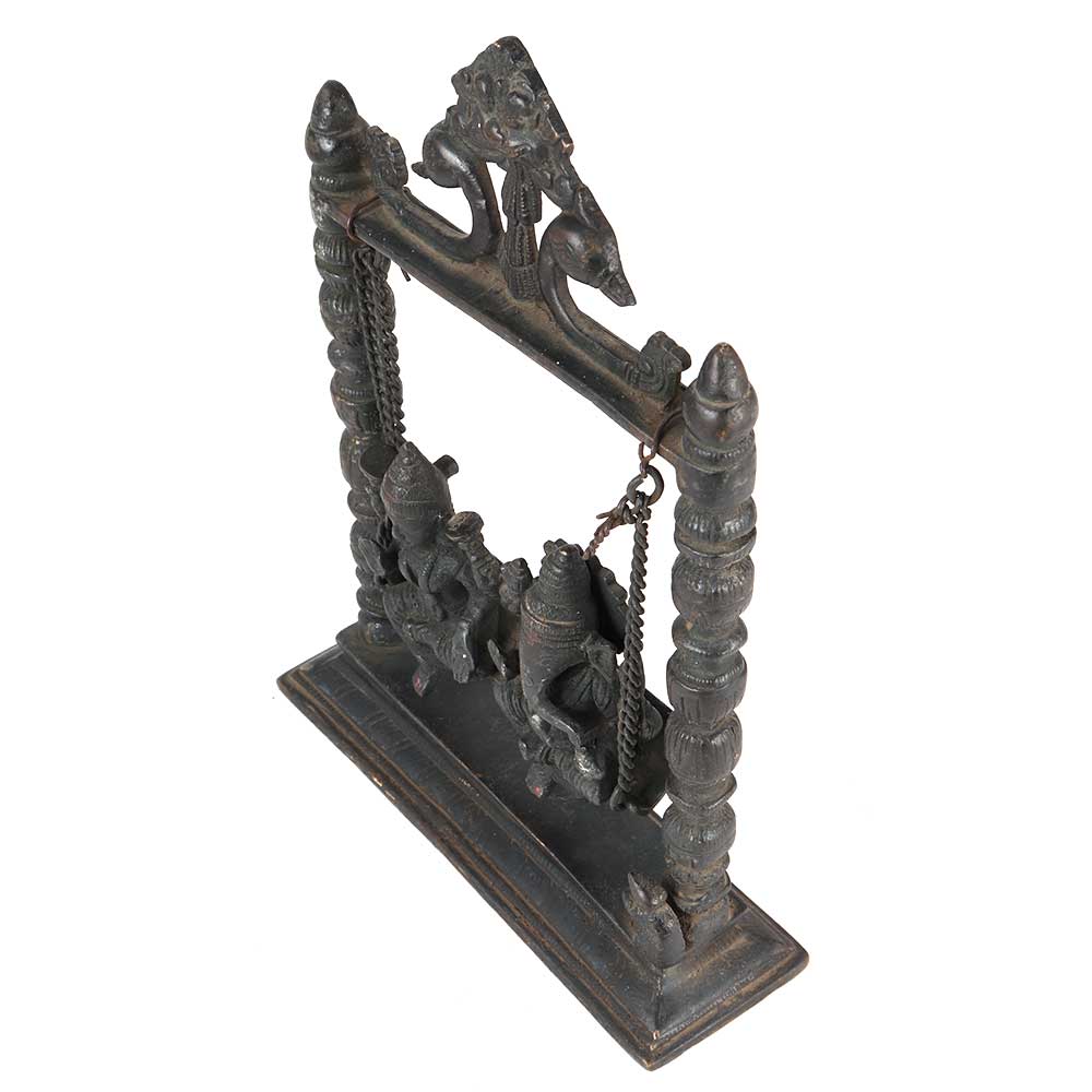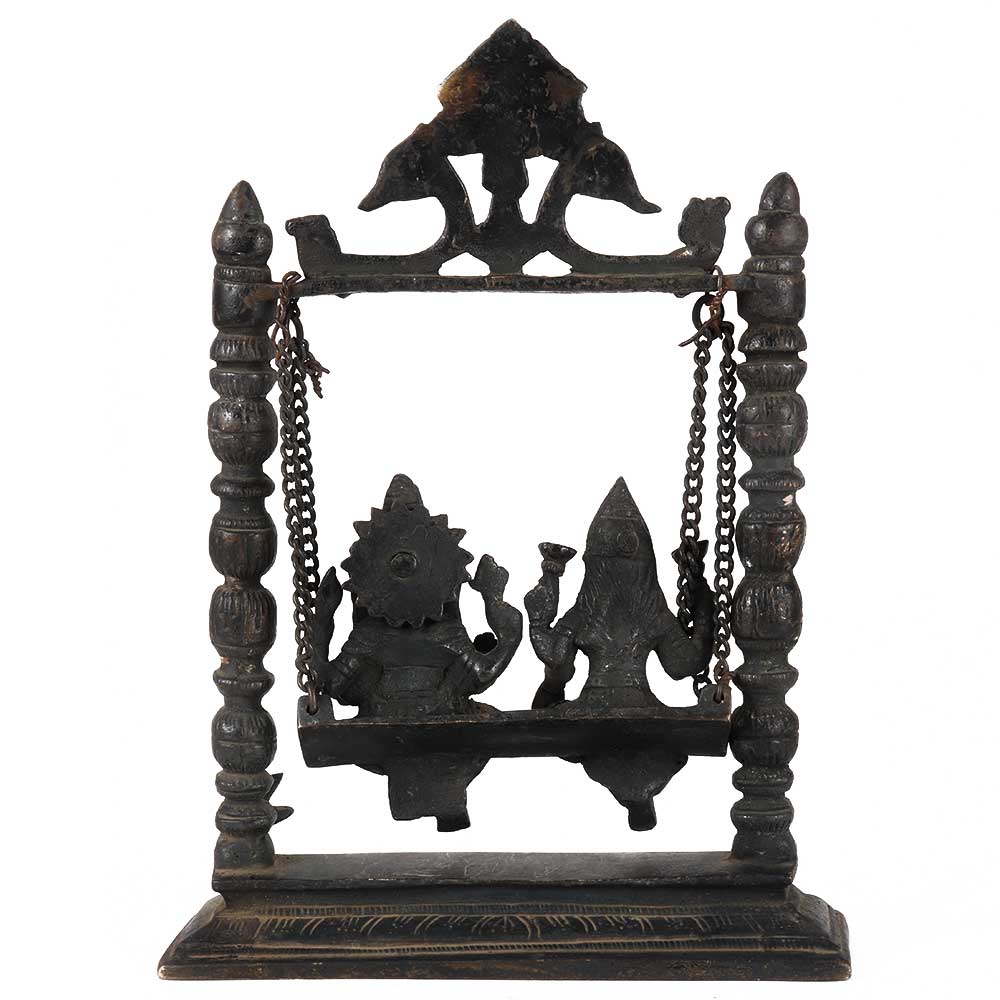 Beautifully crafted brass idol of Goddess Lakshmi and God Ganesha seated on a swing is beautifully crafted. The gods sit serenely with one leg folded, both pouring favors and wealth. The swing is exquisitely crafted, with a peacock motif on the top and long pillars on both sides.