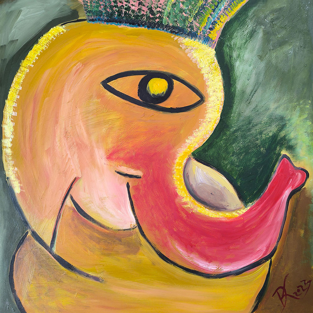 This vibrant oil painting on stretched canvas creatively captures the beloved Hindu deity Lord Ganesha in a unique, contemporary style. With bold, flowing brushwork and radiant colors—warm yellows, vibrant reds, lush greens, and golden highlights—the painting embodies positivity, prosperity, and spiritual enlightenment. Ganesha’s gently smiling visage, rendered in abstract form, exudes warmth, compassion, and divine grace. The painting effortlessly blends tradition with modern artistic expression, inviting joy, harmony, and auspicious energy into any space. Ideal for bringing blessings, serenity, and a touch of artistic elegance into your home or spiritual space.