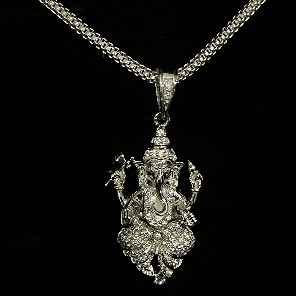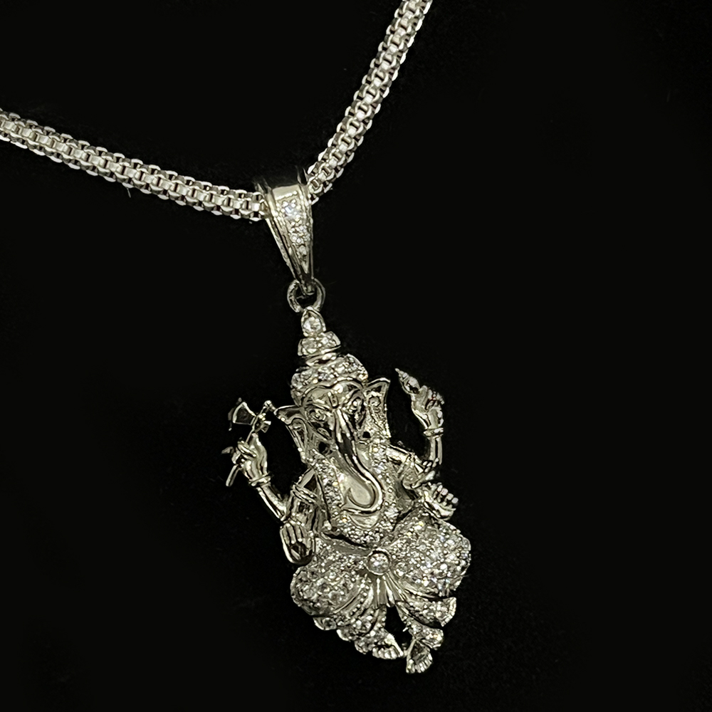 The sculpted Ganesha figure reflects traditional iconography through balanced proportions and intricate hand finishing. The structured form offers presence and clarity while maintaining a wearable pendant scale.
