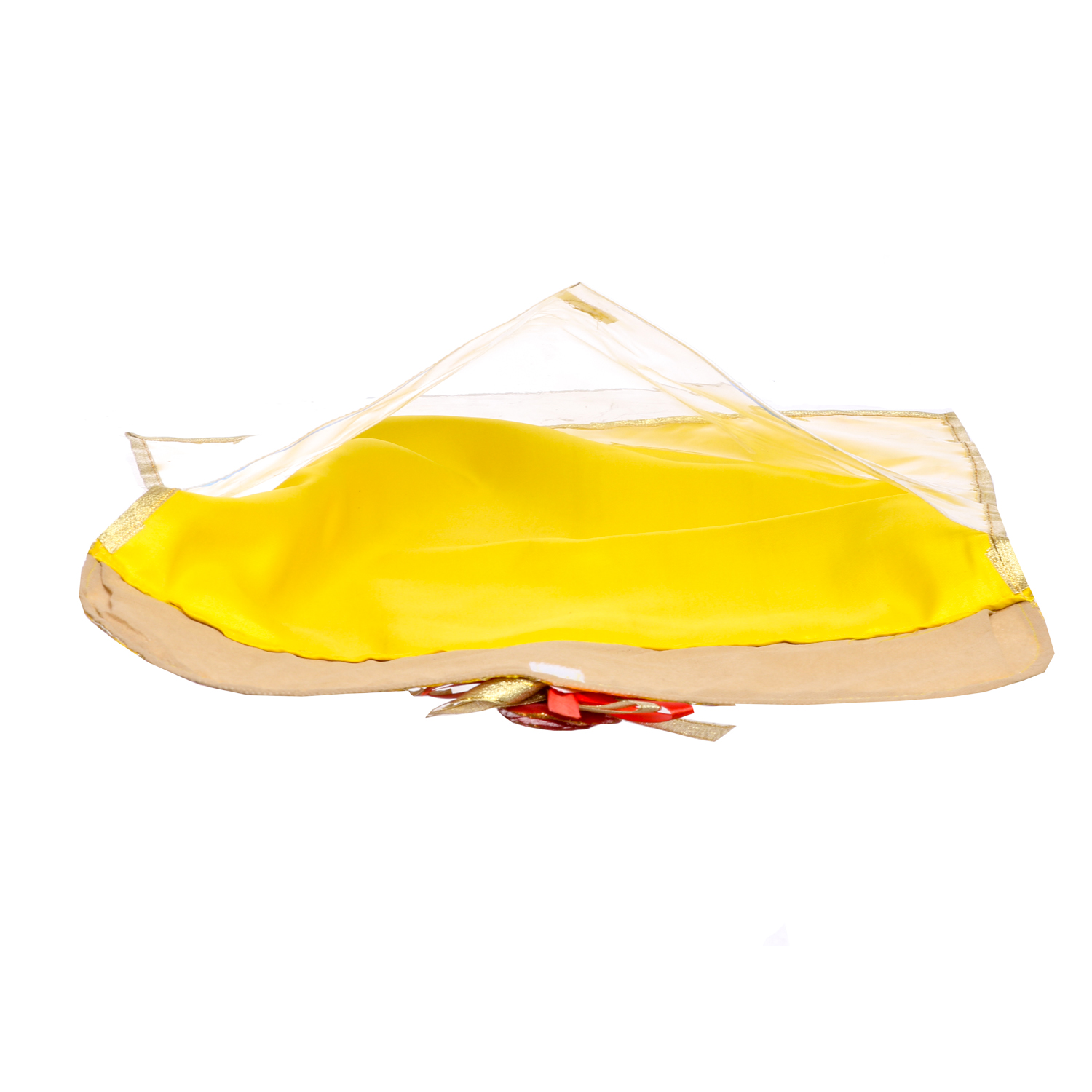 Yellow coloured saree cover with gota work and an attractive red and golden broch. You can use it to gift sarees to your loved ones anytime !
