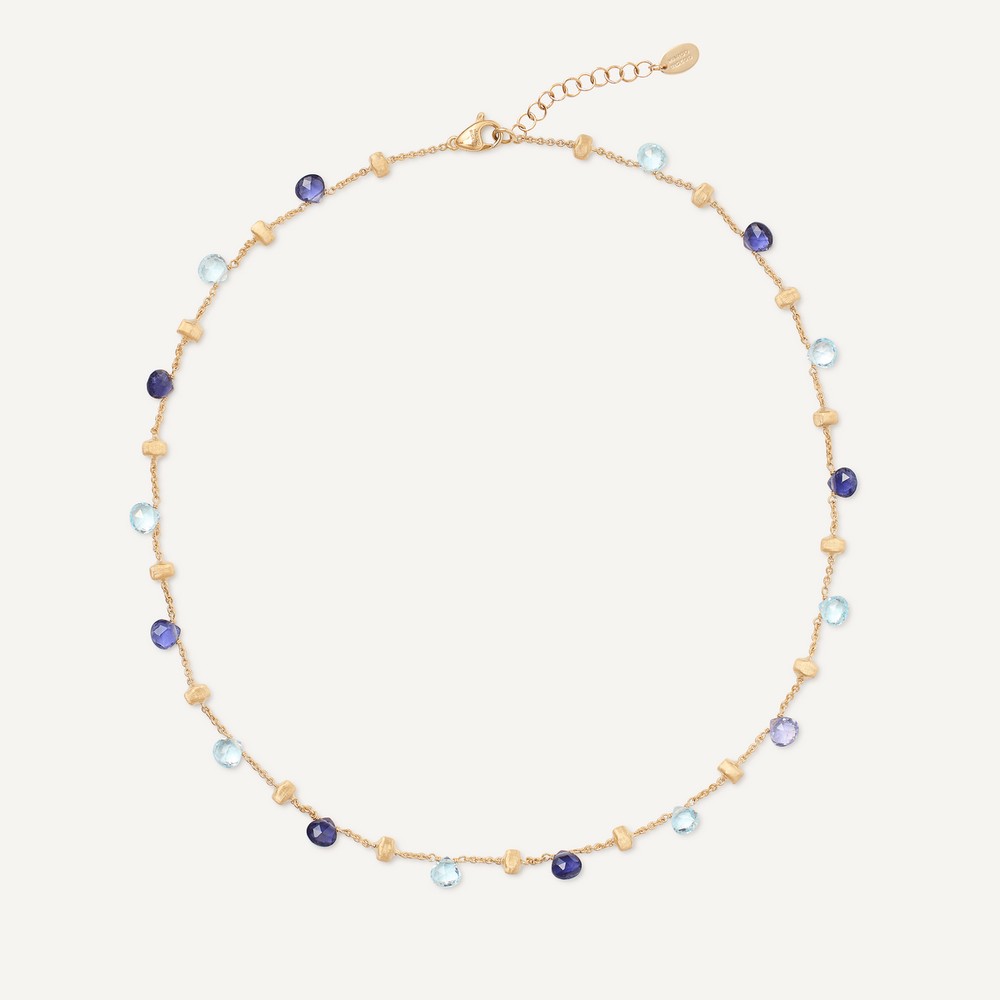 The Gemstone Beaded Marco Bicego Necklace with Iolite, Amethyst and Blue Topaz is designed to bring vibrant sophistication to refined jewelry collections. Crafted with a polished brass base, the necklace features an elegant arrangement of multicolored gemstone beads that create a luminous layered effect. The rich tones of iolite, amethyst, and blue topaz add depth and brilliance, offering a striking contrast against the warm gold tone accents. With its extended 40 inch length, this handcrafted necklace delivers graceful drape and luxurious presence.