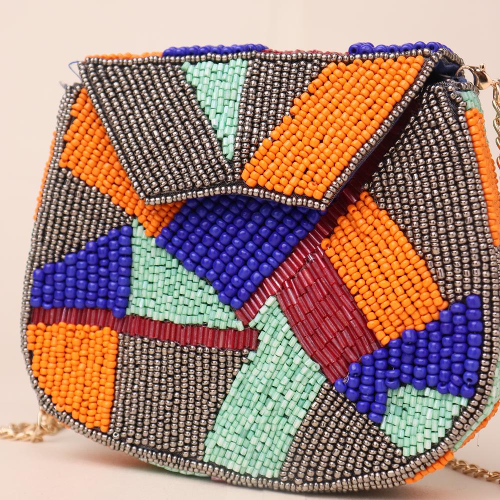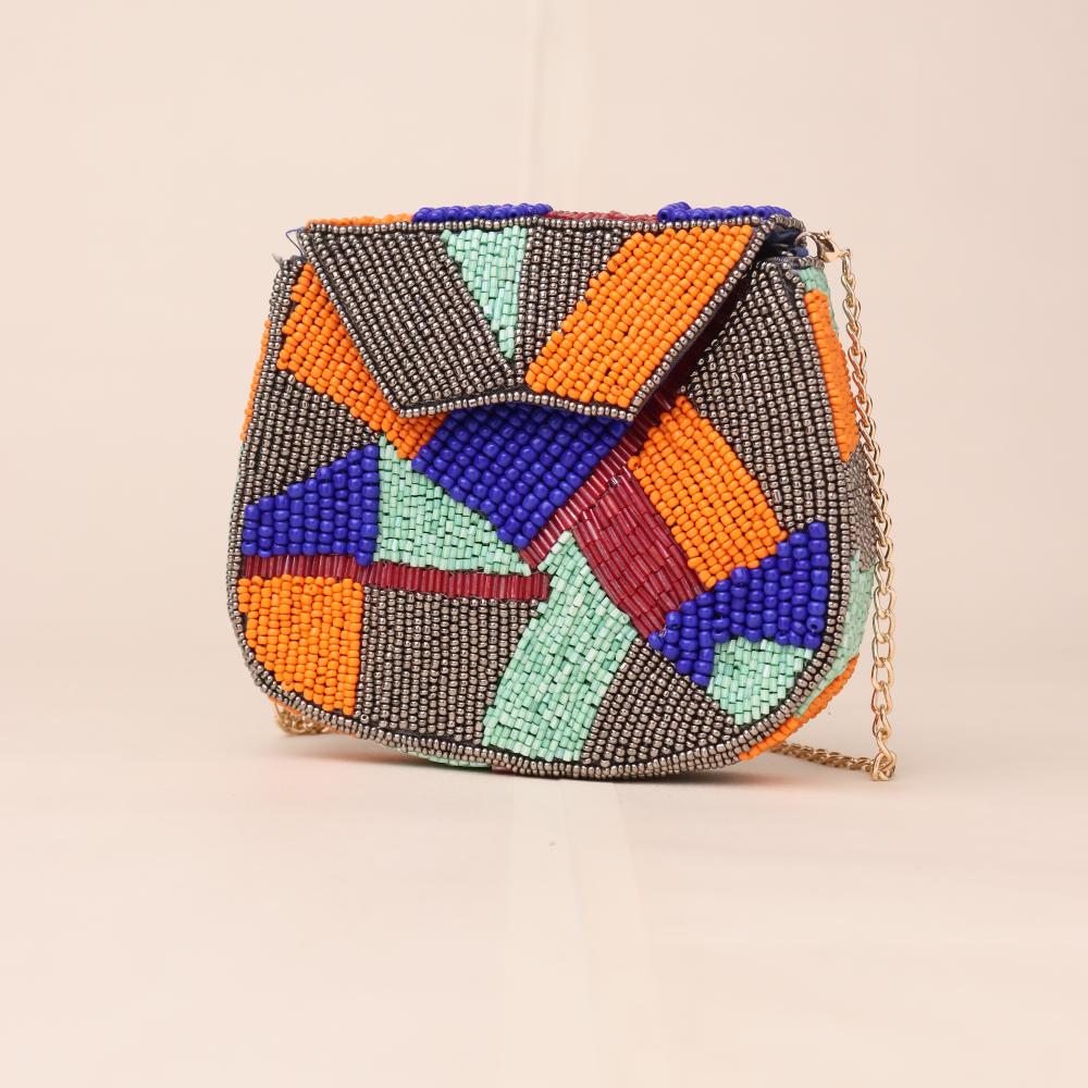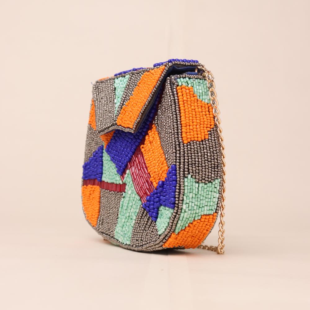 Make a bold statement with this vibrant handcrafted sling bag featuring a geometric patchwork of hand-beaded patterns in orange, cobalt blue, mint green, silver, and maroon. This structured silhouette is both playful and modern, perfect for parties, casual outings, or adding a pop of personality to everyday wear. Complete with a gold sling chain, it effortlessly transitions from crossbody to clutch.