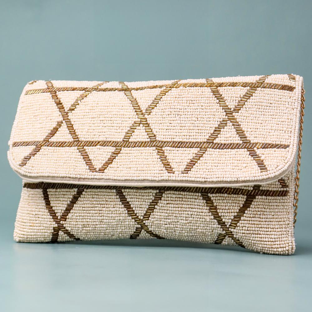 Step into refined minimalism with the Geometric Grace Hand-Beaded Clutch, a harmonious blend of structure and sophistication. Its timeless design features symmetrical beadwork in an intersecting triangle pattern that lends understated charm to any outfit. Whether carried by hand or draped with its elegant chain strap, this clutch is the perfect complement for both daytime soirees and evening affairs.