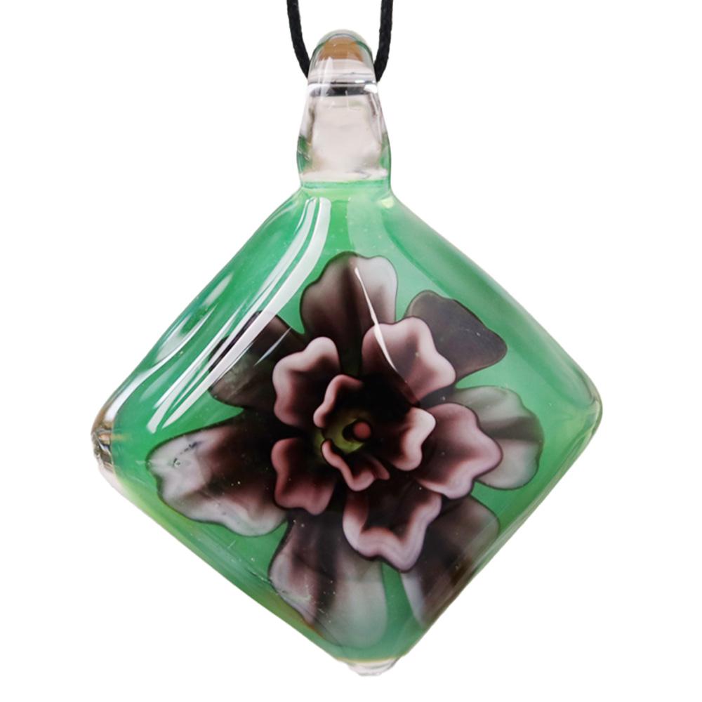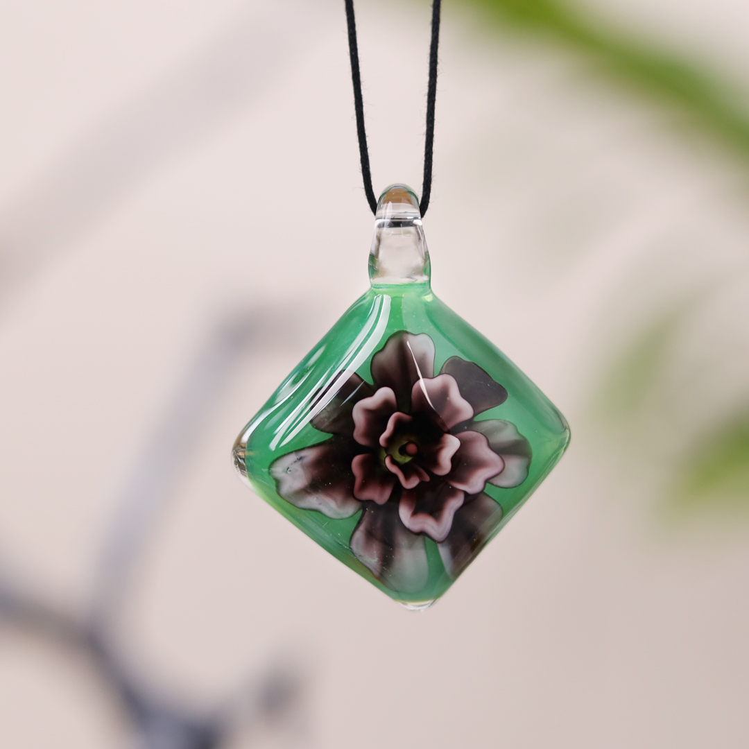 The Lampwork Flower Engraved Green Diamond Glass Pendant is a stunning piece of handmade jewelry that combines the brilliance of green glass with delicate floral engraving. This pendant offers a unique blend of vibrant color and intricate craftsmanship, making it an eye-catching addition to any necklace or jewelry collection. Its diamond-like cut ensures that it catches and reflects light beautifully, adding an element of sparkle to your ensemble.