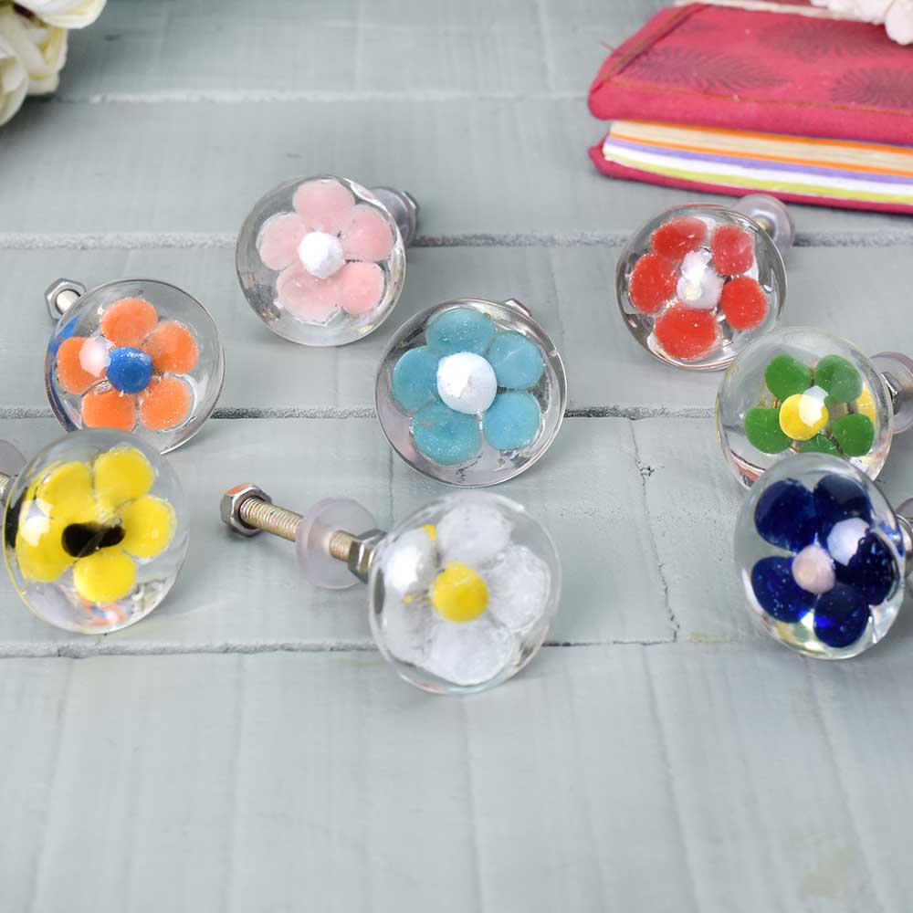 The Glass Flower Engraved Multicolor Cabinet Knobs add a delightful burst of color and charm to your furniture. These knobs feature a stunning glass flower engraving in vibrant hues that bring an artistic touch to any cabinet, drawer, or dresser. Perfect for brightening up any space, they create an inviting and warm atmosphere in your home.