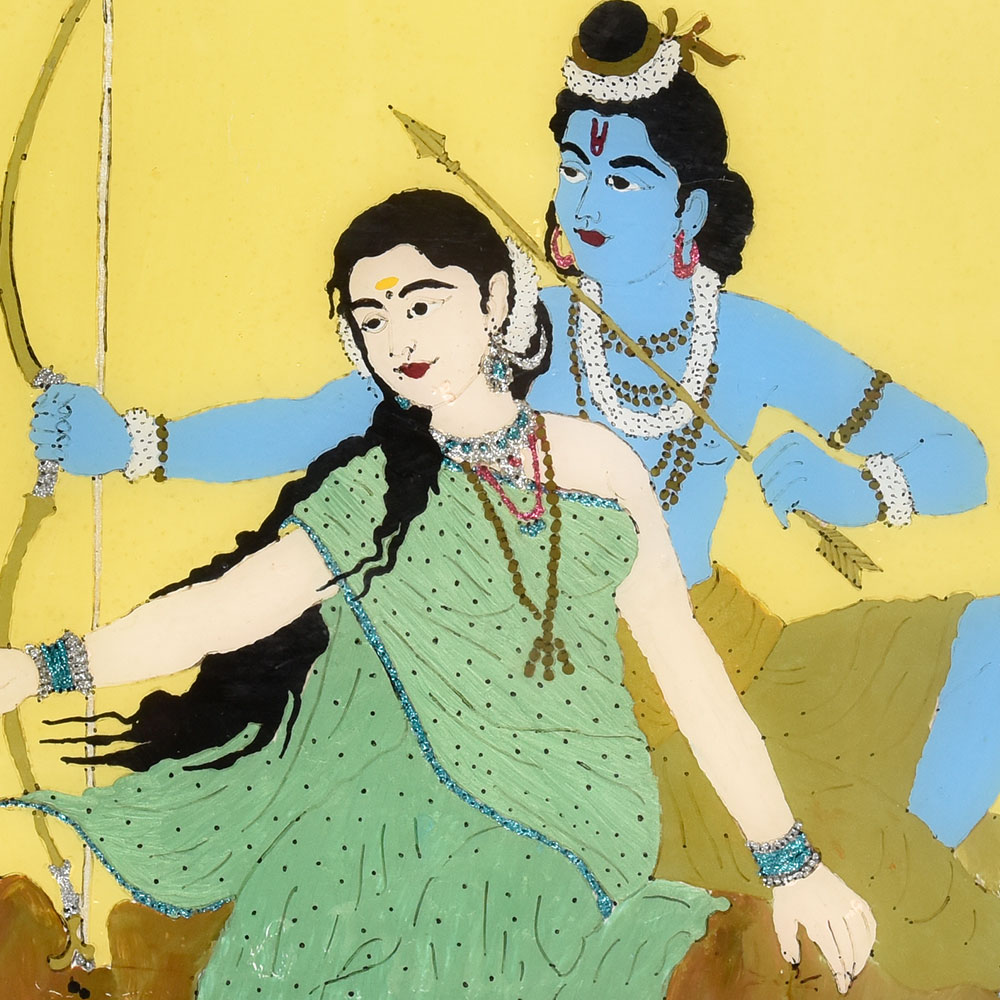 This breathtaking painting isn't just a decoration - it's a portal into a world of spirituality and wonder. The depiction of Rama and Sita, the embodiment of dharma and devotion, will inspire you to reflect on the timeless values of love, loyalty, and righteousness. Display this painting in your home, and let it be a constant reminder of the power of the divine and the beauty of the human spirit. Whether you're a devoted Hindu, an art enthusiast, or simply someone who appreciates the beauty of cultural traditions, this Glass Painting of Rama and Sita in Yellow Colour is a must-have for your home. Elevate your space with this captivating piece and let it transport you to a realm of spiritual enlightenment and artistic excellence.