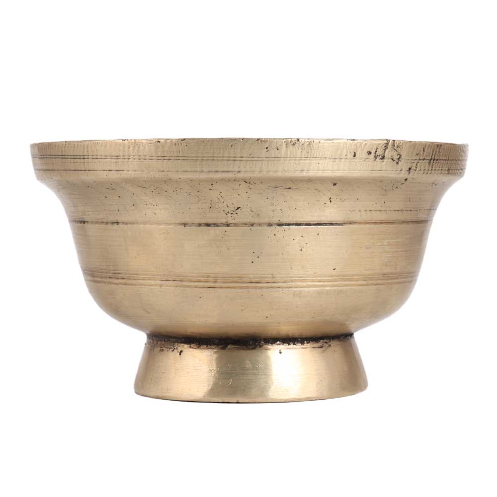 Add a touch of elegance and spirituality to your home with this gorgeous South Indian brass bowl. This handmade bowl is typically used for kumkum tilak during religious ceremonies and is a symbol of divinity and auspiciousness. The intricate and shiny design is sure to grab the attention of any visitor and is perfect for displaying as a decorative item. Collectors of vintage items will love this beautiful piece that captures the essence of South Indian art and tradition. It's not just a bowl but a reminder of the rich cultural heritage of India. You can also gift this incredible item to your loved ones on special or festive occasions.