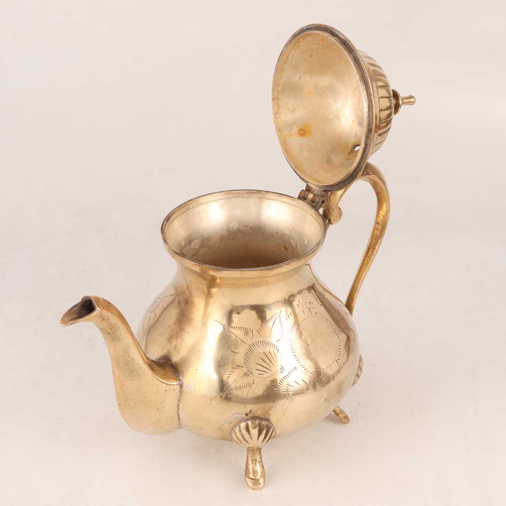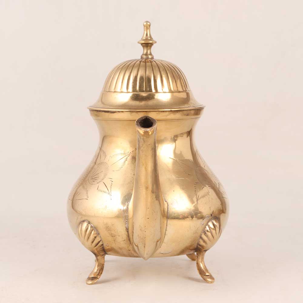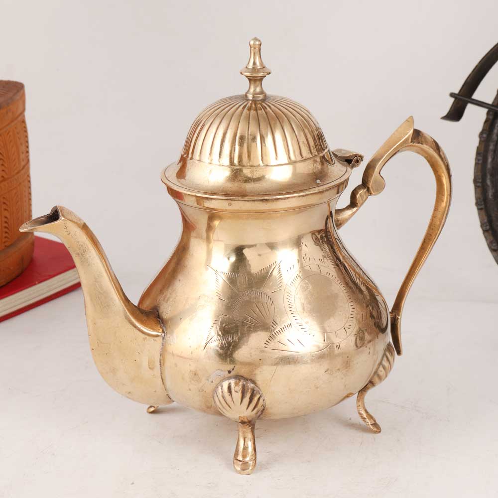Transport yourself back to an era of elegance with this vintage brass kettle, a true testament to timeless craftsmanship and aesthetic allure. This ornate piece is adorned with intricate engravings that showcase the mastery of talented artisans from the renowned English Art tradition. Crafted from high-quality brass with a lustrous golden finish, this kettle exudes opulence and sophistication, instantly capturing the eye and adding an air of refinement to any space. Its striking lid and elegantly shaped spout reflect the meticulous attention to detail, while four sturdy legs provide a stable base when placed on any surface. While originally used for keeping tea, its vintage charm is now better suited for decorative purposes rather than cooking. Ideal for home, office, restaurant, hotel, or café settings, it infuses spaces with a sense of old-world charm and nostalgia. Whether displayed at exhibitions or added to a vintage collection, this brass kettle is a collector's dream. More than just a decorative piece, it also makes for a thoughtful gift to cherish special moments. Present it to your family, friends or relatives on auspicious occasions, festive celebrations, or milestone events, symbolizing the beauty of enduring craftsmanship and the warmth of timeless memories.