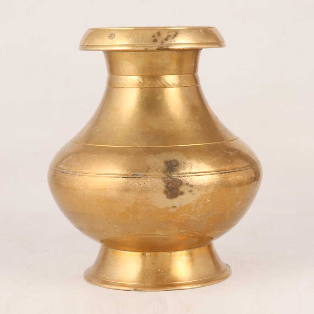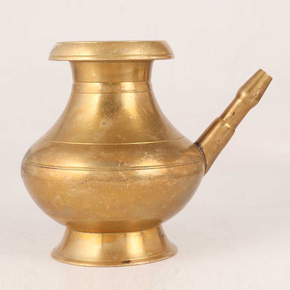 This brass holy water pot with a delicately crafted spout is a masterpiece of artistry and devotion. Skillfully handmade by talented Indian craftsmen, this exquisite piece is crafted with meticulous attention to detail, using high-quality brass for a lustrous and antique golden finish that exudes elegance and grandeur. Versatile in its application, this holy water pot finds a cherished place in any setting, be it your home, office, restaurant, hotel, or cafe. Its presence instantly elevates the ambiance, adding a touch of sacred beauty to any space. At exhibitions, it becomes a captivating focal point, impressing visitors with its intricate design and cultural significance. Embracing a deep-rooted tradition, this brass water pot is not only a decorative item but also a medium for offering blessings to devotees. Pouring water from the elegantly crafted spout symbolizes bestowing spiritual purification and good fortune upon the faithful. Moreover, this divine creation serves as a thoughtful and heartfelt gift for your family, friends or relatives on special, festive, or auspicious occasions. By presenting them with this sacred treasure, you impart your warm wishes and share the essence of spirituality and artistry.