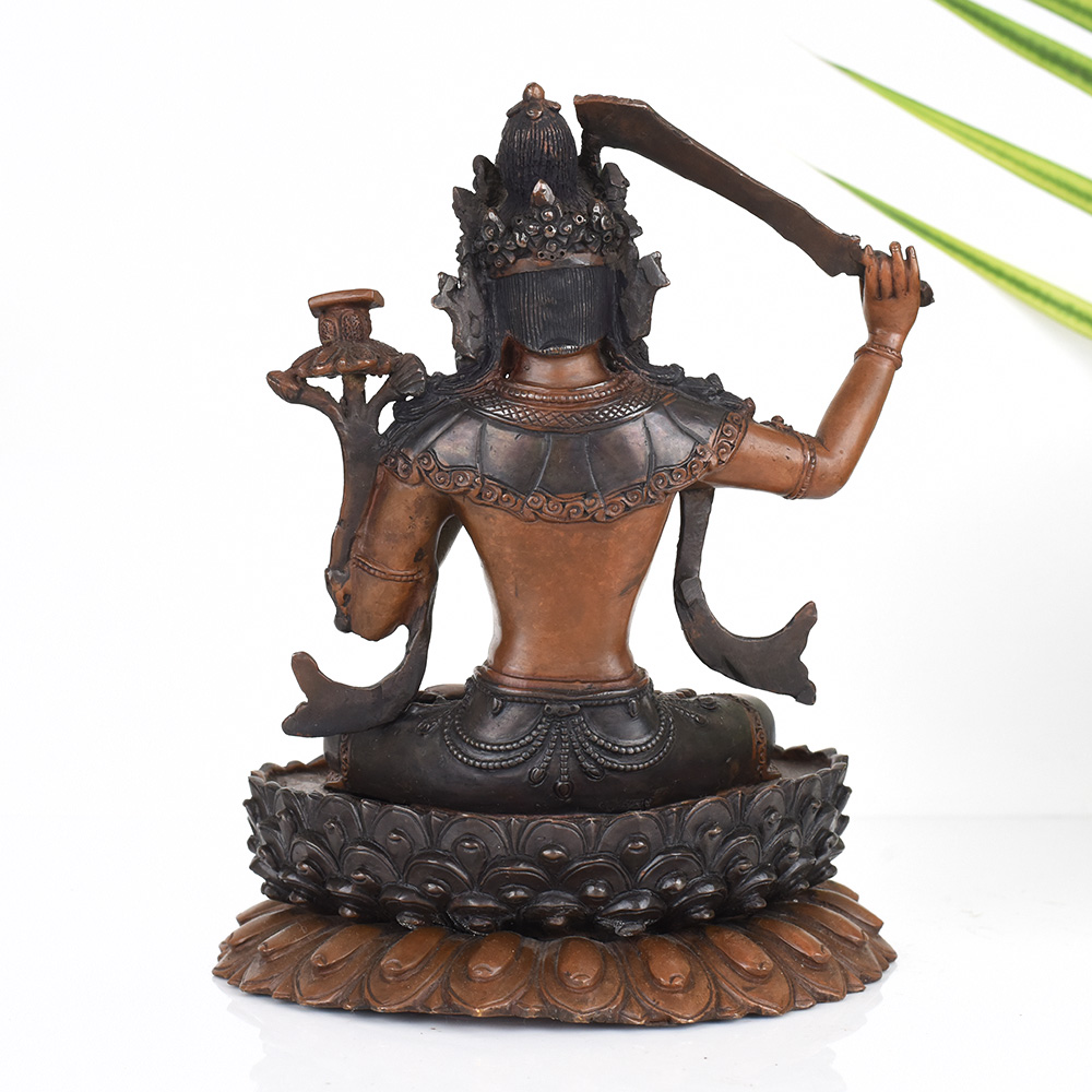 Manjushri, the "Gentle Glory," is revered across the Tibetan Buddhist world as the personification of transcendent wisdom. This vintage copper statue captures his essence, radiating an aura of profound insight and clarity. As you gaze upon his tranquil features, you'll feel a sense of inner calm and focus wash over you, helping to quiet the mind and open you to deeper spiritual understanding. Place this stunning Manjushri statue in your prayer room or meditation space to cultivate wisdom, discernment and the courage to cut through illusion. Its grounding presence will inspire you to deepen your practice, whether through seated contemplation, mantra recitation or study of the Dharma. Invite the blessings of this enlightened being into your life and experience the transformative power of his celestial energy.